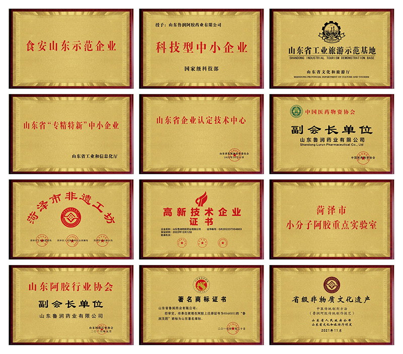 山東魯潤阿膠藥業(yè)有限公司現(xiàn)為“中國醫(yī)藥物資協(xié)會(huì)副會(huì)長單位”、“山東省阿膠行業(yè)協(xié)會(huì)副會(huì)長單位”、“山東省營養(yǎng)保健食品行業(yè)協(xié)會(huì)副會(huì)長單位”。公司先后被評為“國家級高新技術(shù)企業(yè)”、“國家級科技型中小企業(yè)”“山東省專精特新中小企業(yè)”、“山東省認(rèn)定企業(yè)技術(shù)中心”、“菏澤市小分子阿膠重點(diǎn)實(shí)驗(yàn)室”、“食安山東示范企業(yè)”、生產(chǎn)廠區(qū)被評為“山東省工業(yè)旅游示范基地”、“菏澤市非遺工坊”、“菏澤市非遺實(shí)踐教育基地”,并被國家安全生產(chǎn)監(jiān)督管理總局認(rèn)定為“安全生產(chǎn)標(biāo)準(zhǔn)化企業(yè)”。魯潤阿膠制作工藝被評為“山東省非物質(zhì)文化遺產(chǎn)”,魯潤阿膠董事長鄧來義先生被評為“阿膠制作技藝傳承人”。公司擁有七十多項(xiàng)專利,成功注冊“魯潤”、“多美膠”等多個(gè)商標(biāo),其中“魯潤”商標(biāo)為山東省著名商標(biāo)。