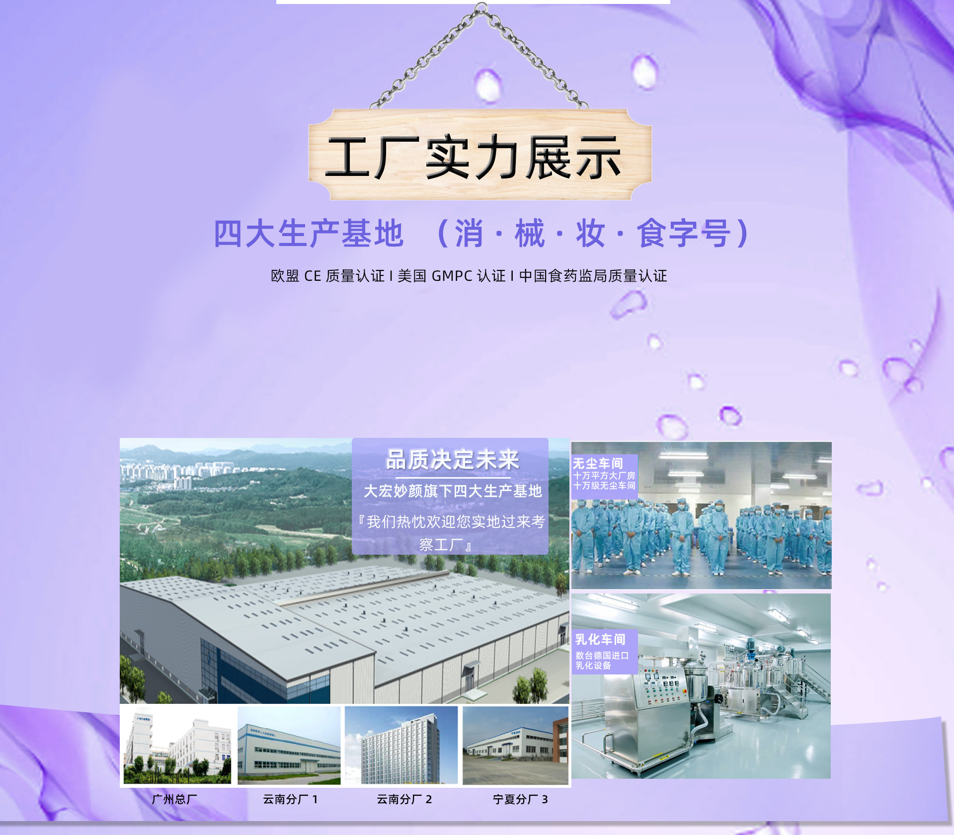 廣州大宏妙顏生物是廣東家安集團旗下一家集護膚、養(yǎng)生、私密、口服酵素、等產品專業(yè)OEM/ODM一條龍服務的公司,擁有完整、科學的質量管理體系。 擁有妝字號、消字號、械字號、食字號四大生產許可證。 公司擁有專業(yè)海內外研究團隊,支持代研發(fā)新品、來樣仿樣、等多種靈活方式。公司秉承“客戶至上、銳意進取”的經營理念,堅持安全合法、優(yōu)質服務的原則為廣大客戶提供服務公司的誠信、實力和產品質量均獲得業(yè)界的認可。(被評為質量誠信AAAAA企業(yè))歡迎各界朋友蒞臨參觀、指導和業(yè)務洽談。