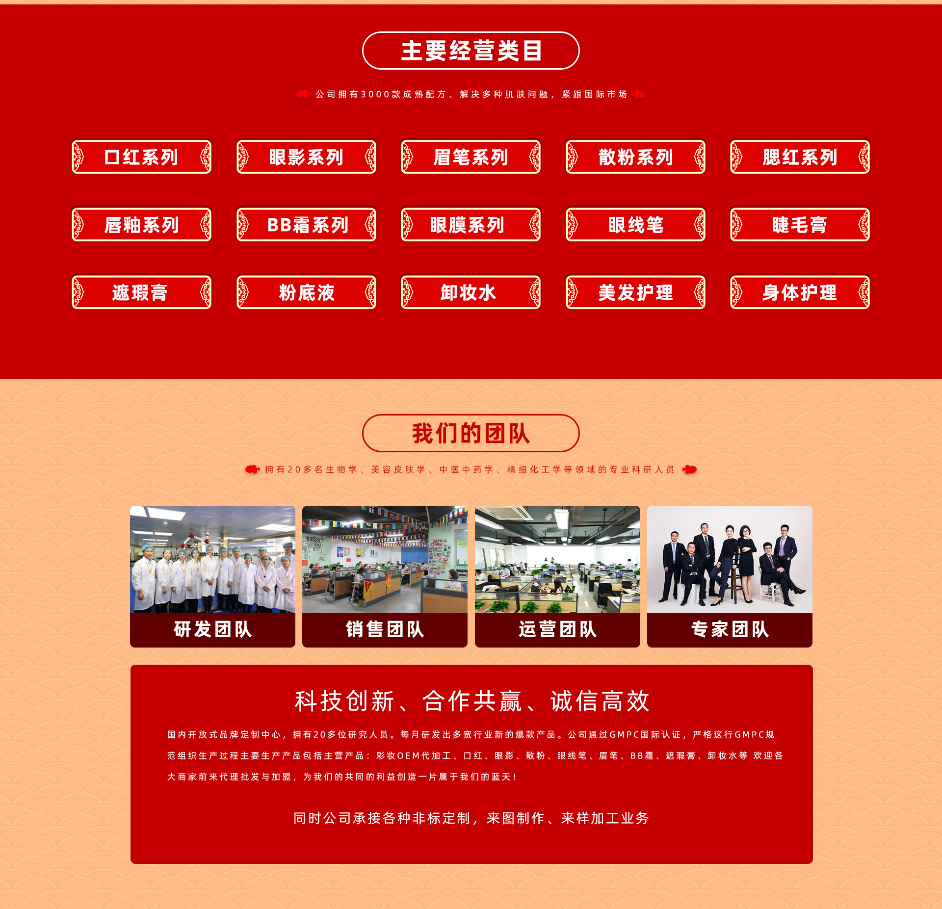 廣州若妝化妝品有限公司是集彩妝、護膚化妝品、化妝品原料、包裝、化妝品批發及零售等產品專業生產加工的公司,擁有完整、科學的質量管理體系。廣州若妝化妝品有限公司的誠信、實力和產品質量獲得業界的認可。歡迎各界朋友蒞臨參觀、指導和業務洽談。