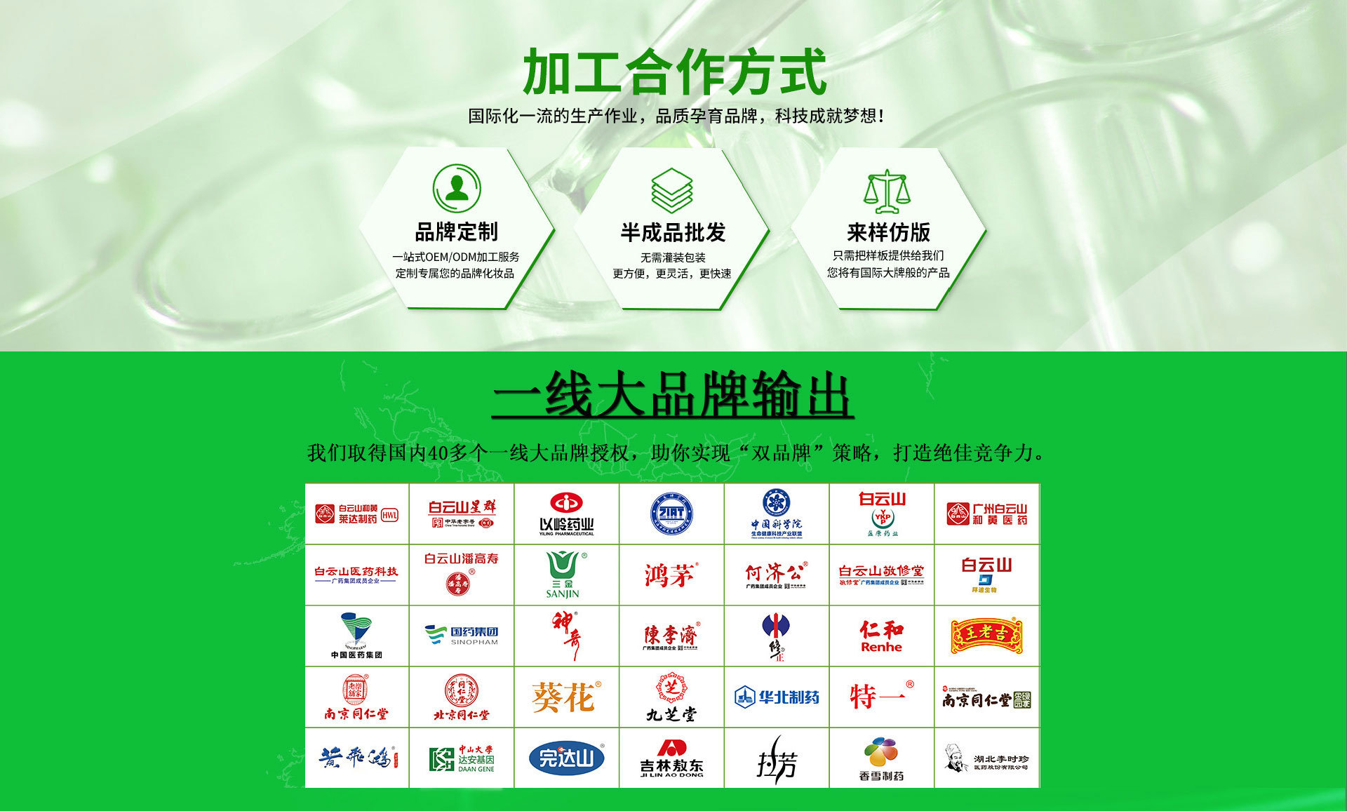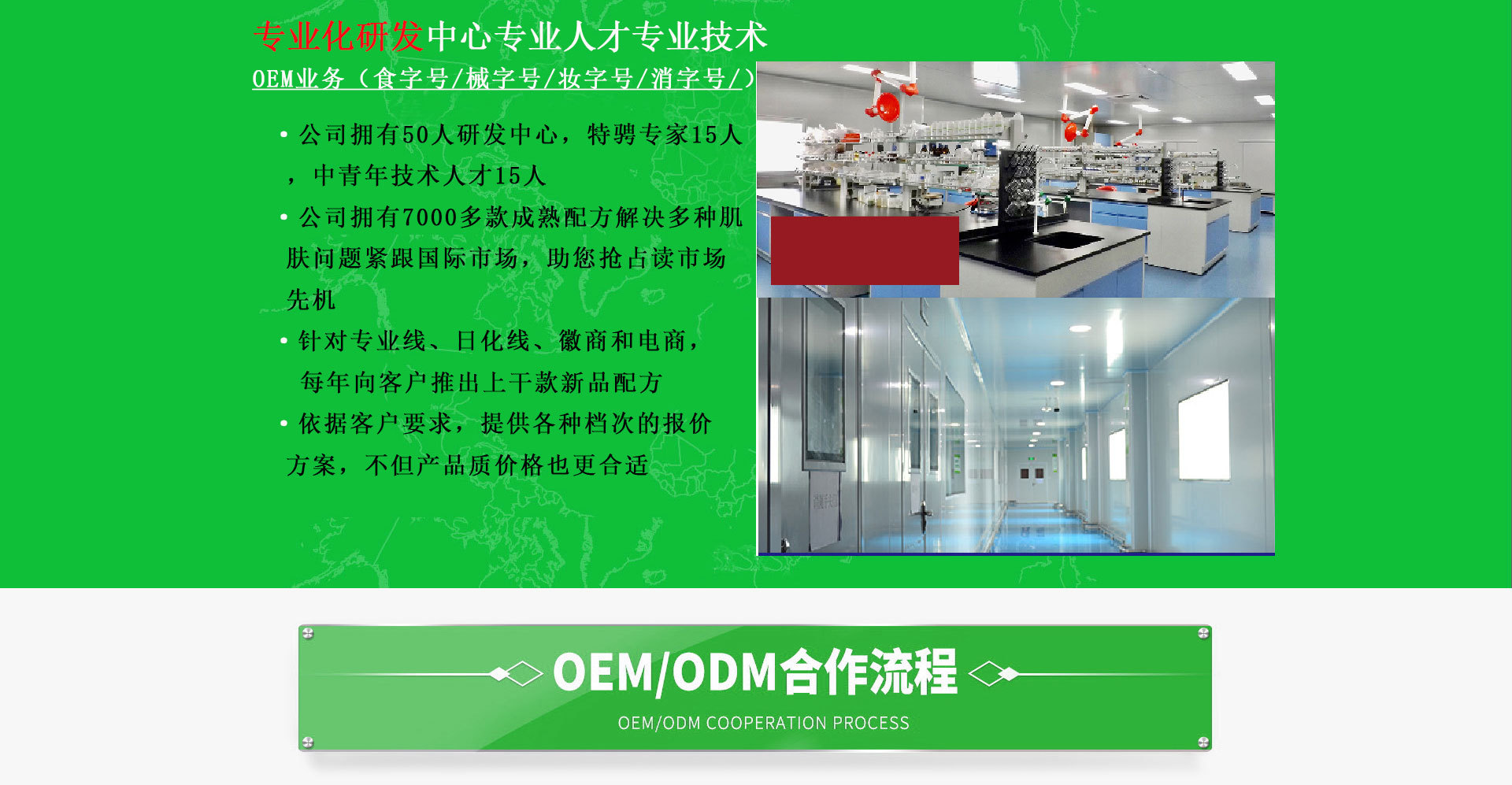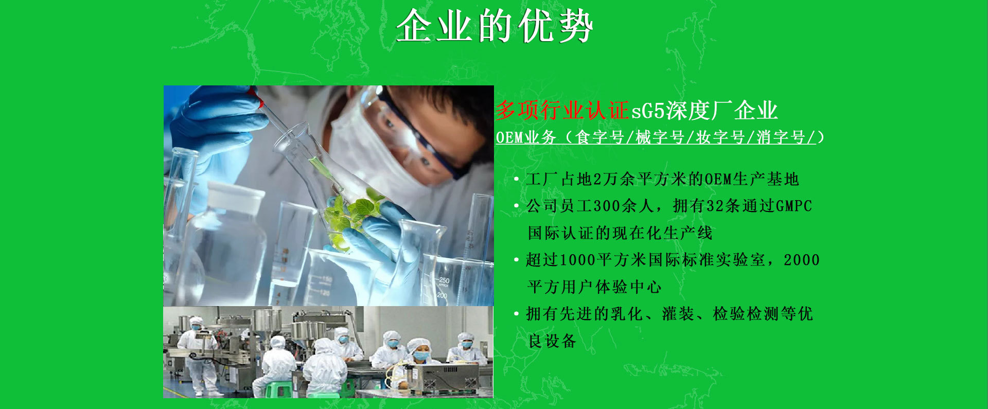 廣州中科醫藥科技有限公司是一家 多項行業認證sG5深度廠企業OEM業務(食字號/械字號/妝字號/消字號) ·工廠占地2萬余平方米的OEM生產基地 ·公司員工300余人,擁有32條通過GMPC國際認證的現在化生產線 ·超過1000平方米國際標準實驗室,2000平方用戶體驗中心 ·擁有先進的乳化、灌裝、檢驗檢測等優良設備; 專業化研發中心專業人才專業技術OEM業務 ·公司擁有50人研發中心,特騁專家15人,中青年技術人才15人 ·公司擁有7000多款成熟配方解決多種肌膚問題緊跟國際市場,助您搶占讀市場先機 ·針對專業線、日化線、徽商和電商,每年向客戶推出上干款新品配方 ·依據客戶要求,提供各種檔次的報價方案,產品質優,價格也更合適。