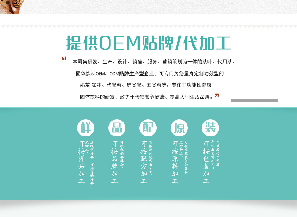 廈門瀚偉食品科技有限公司是一家集研發、生產、設計、銷售、服務、營銷策劃為一體的茶葉、代用茶、固體飲料OEM、ODM貼牌生產型企業,可專門為您量身定制功效型的奶茶、咖啡、代餐粉、辟谷排毒餐、五谷粉等。 廈門瀚偉食品為了更好地提供高品質的代工服務,成立專業的研發機構,專注于全方位功能性健康固體飲料的研發,致力于傳播營養健康、提高人們生活品質。 廈門瀚偉食品以“高品質、高創新、高誠信”三大原則為企業宗旨,秉承為客謀利、促進銷售、傳遞財富、傳承共贏的經營理念,為客戶提供更方便、更快捷的商業化平臺