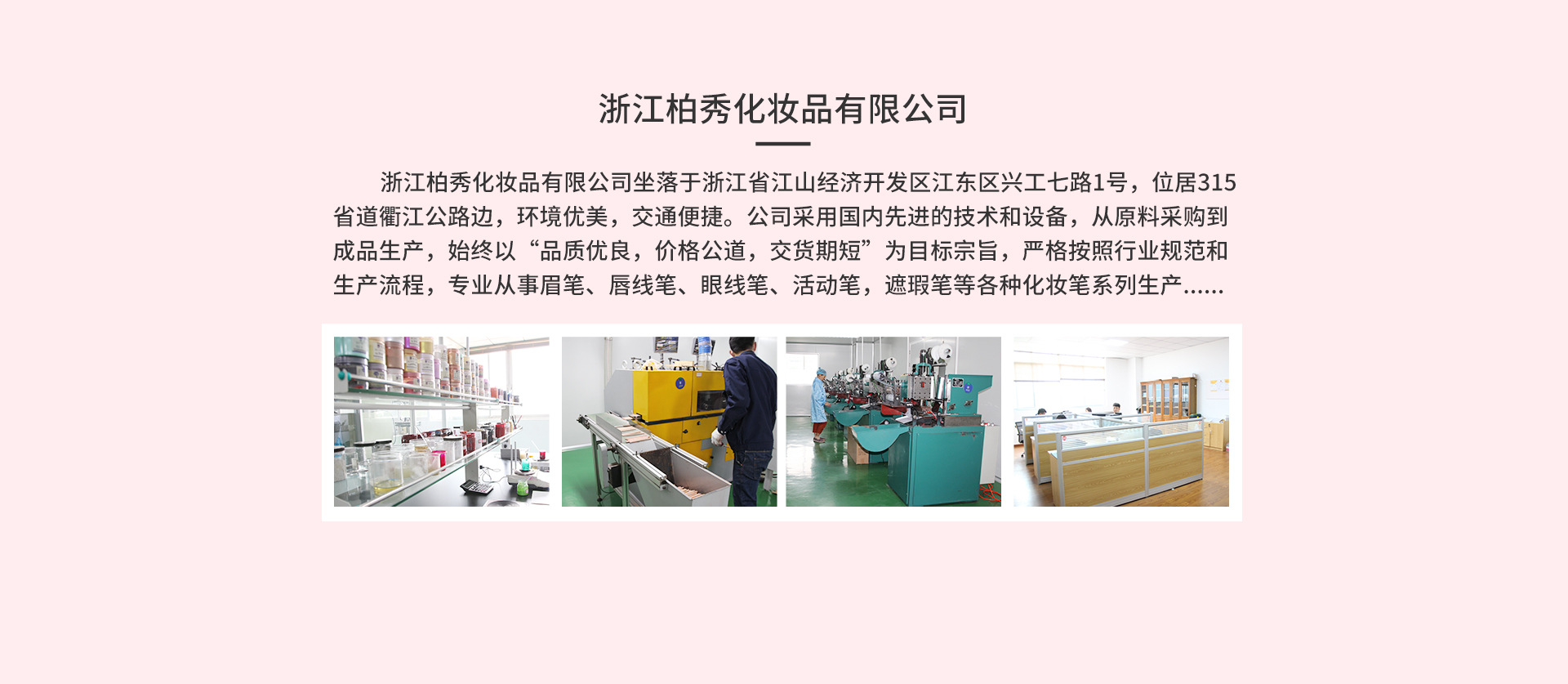 浙江柏秀化妝品有限公司坐落于浙江省江山經(jīng)濟(jì)開發(fā)區(qū)江東區(qū)興工七路1號,位居315省道衢江公路邊,環(huán)境優(yōu)美,交通便捷。公司采用國內(nèi)先進(jìn)的技術(shù)和設(shè)備,從原料采購到成品生產(chǎn),始終以“品質(zhì)優(yōu)良,價(jià)格公道,交貨期短”為目標(biāo)宗旨,嚴(yán)格按照行業(yè)規(guī)范和生產(chǎn)流程,專業(yè)從事眉筆、唇線筆、眼線筆、活動(dòng)筆,遮瑕筆等各種化妝筆系列生產(chǎn)......