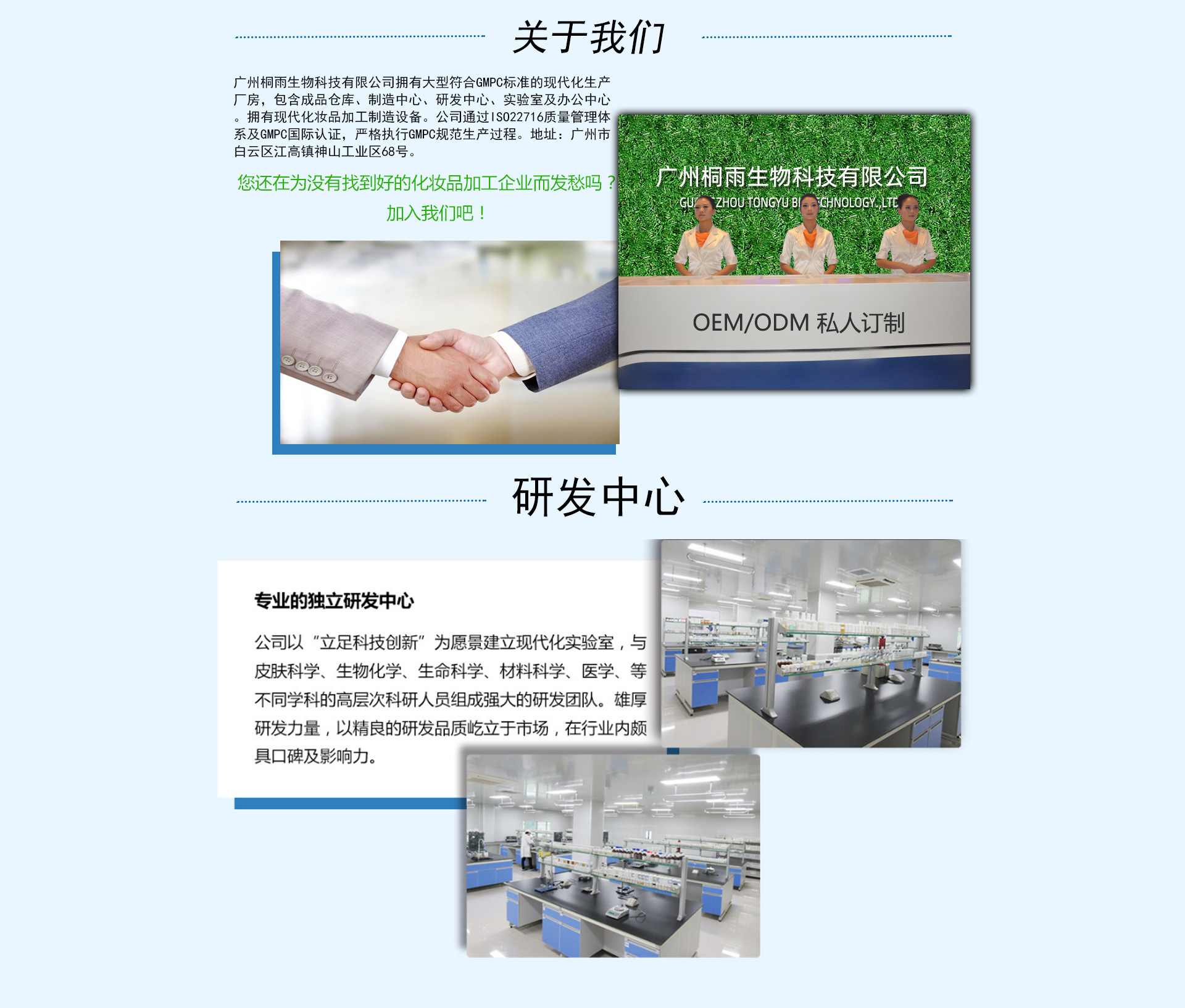 本公司集研發(fā)、生產(chǎn)、銷(xiāo)售一體化的企業(yè);自主品牌的生產(chǎn)與銷(xiāo)售;同時(shí)承接品牌商產(chǎn)品代加工服務(wù)。工廠車(chē)間環(huán)境:10萬(wàn)級(jí)GMP無(wú)塵車(chē)間;可生產(chǎn)的產(chǎn)品:口腔用品、護(hù)膚、養(yǎng)生、精油、面膜、水、乳液、精華、膏霜、眼部產(chǎn)品、彩妝、洗發(fā)水、沐浴露、護(hù)發(fā)品及嬰幼兒產(chǎn)品等等!起定量靈活、交貨期快、生產(chǎn)能力擁有大噸位的真空乳化鍋多個(gè);可承接大批量的產(chǎn)品生產(chǎn)。