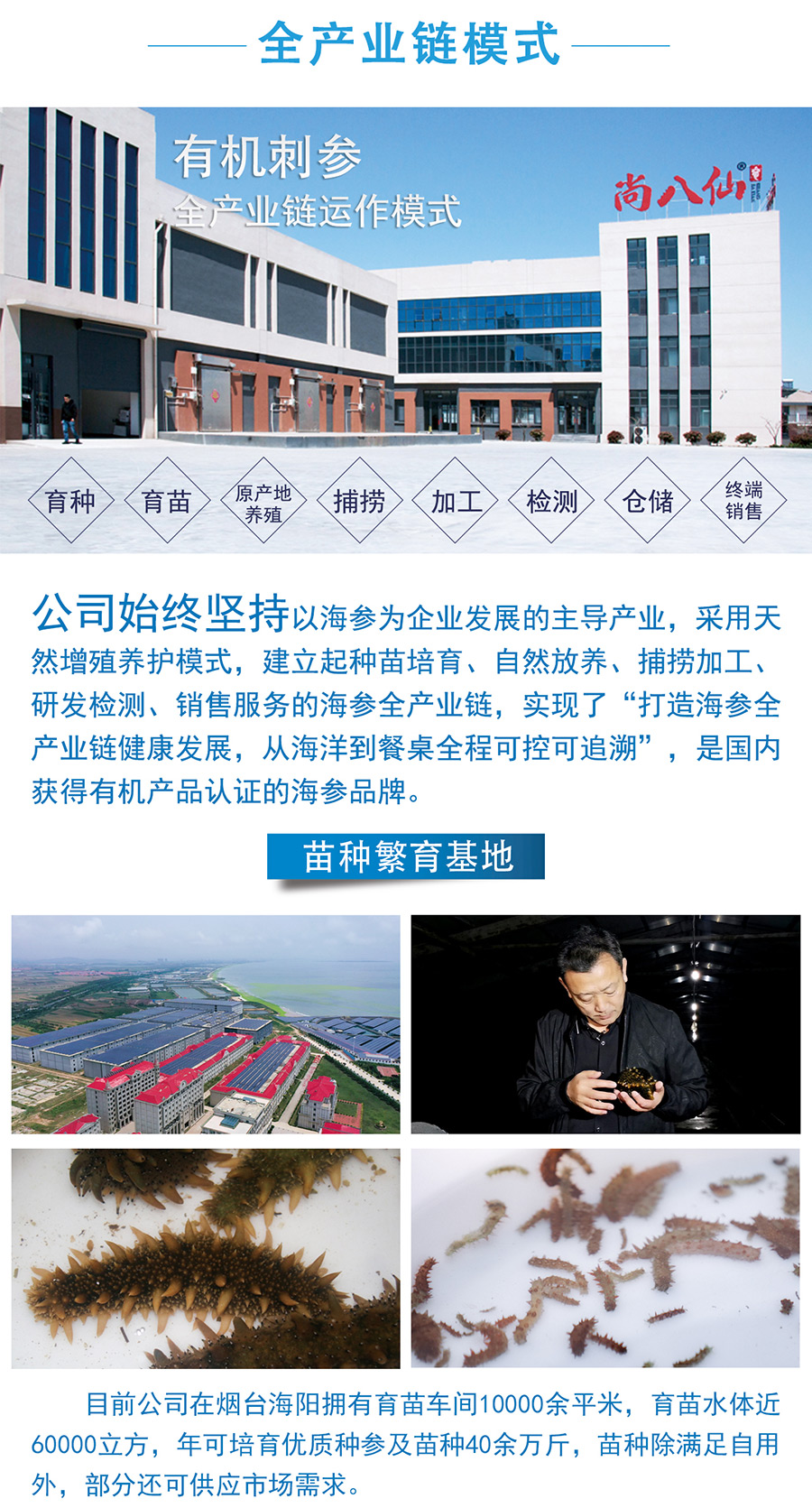 公司構建了全方位的海參產銷一體化鏈條,打造出“產銷+體驗”、“線下+線上”的“全鏈條”產業王國。減少銷售中間環節,縮短產品從“源頭”到“終端”,從“基地”到“餐桌”的距離。