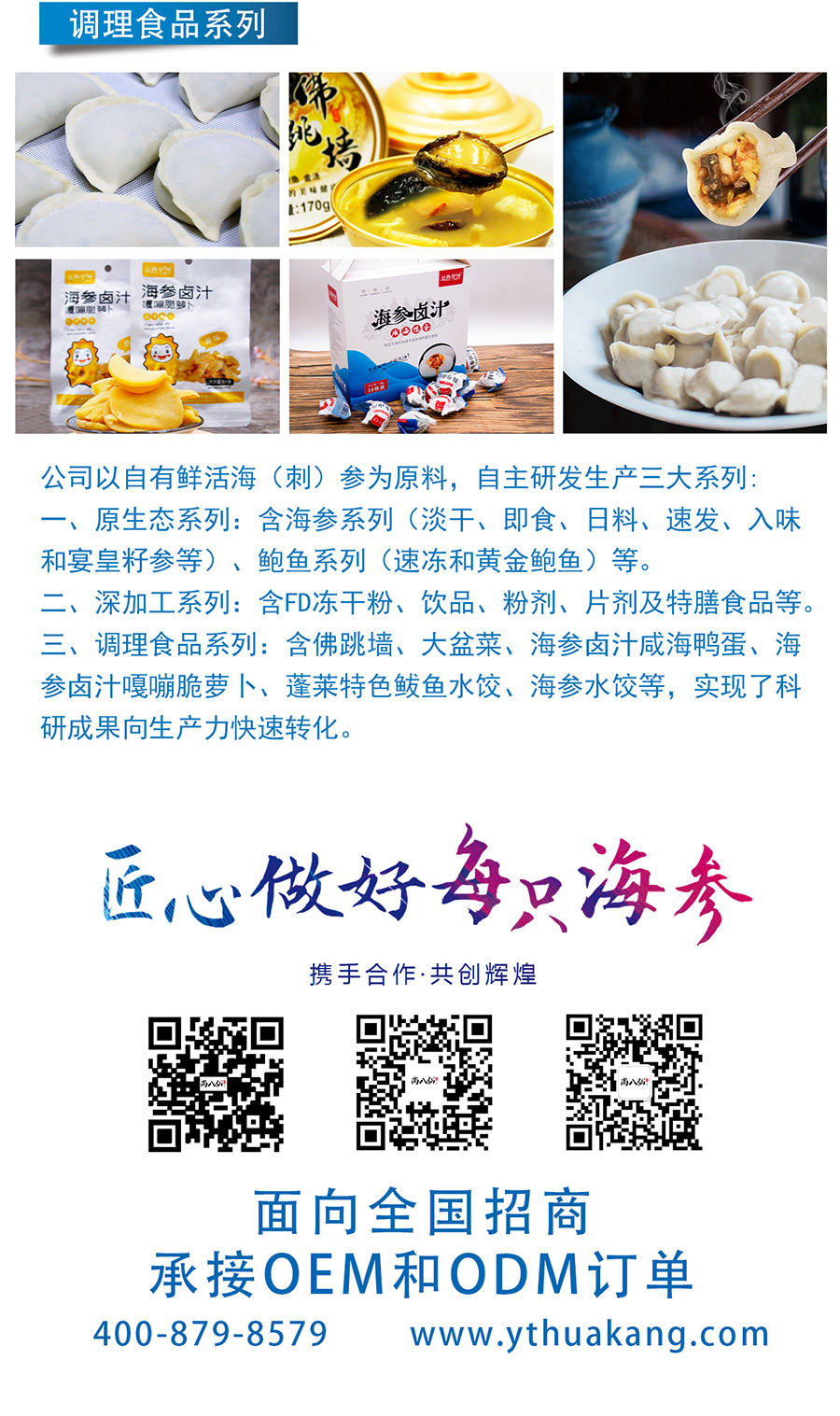 企業的發展離不開科技的支撐,公司在加大研發投入,打造自有科技研發團隊的同時,加強與省內外的多所高校院所開展產學研合作。通過科技成果轉化,研發并生產了三大系列:一、原生態系列:淡干海參、即食海參、日料海參、速發海參、入味海參和宴皇籽參等。二、精深加工系列:含FD參花凍干粉、純海參原漿、海參酶解凍干粉、靈動八仙片、海參牙鈣片及海參特膳食品等。三、方便食品系列:含佛跳墻、大盆菜、海參鹵汁咸海鴨蛋、海參鹵汁嘎嘣脆蘿卜、蓬萊特色鲅魚水餃、海參水餃等百余款產品。公司產品均獲得ISO22000質量安全體系認證,產品全部由中國人壽保險公司承保。