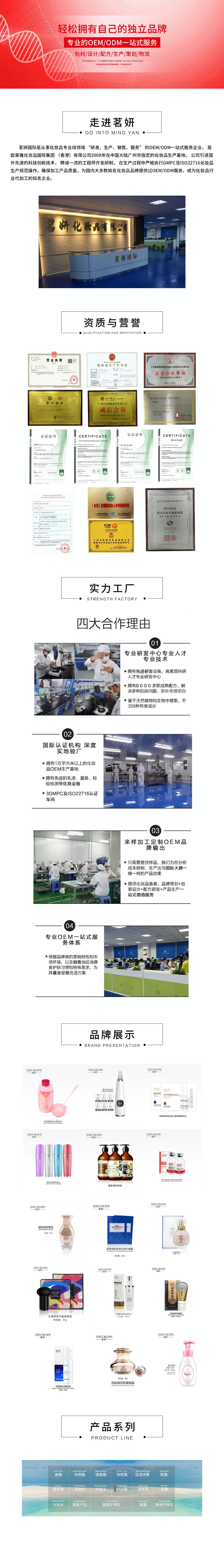 茗妍國際美容集團是一家集“生產、教育、連鎖、策劃、銷售、服務”于一體的中國最具系統價值的大型美容企業。旗下有廣州茗妍國際化妝品廠(該廠以品牌生產的技術為核心)、廣州巨人化妝品有限公司(以品牌營銷開發為核心)、香港巨人國際商學院(以教育培訓傳播為核心)、茗妍.圖瀾朵(國際)連鎖美業公司(以品牌連鎖運營為核心)。 茗妍國際化妝品廠與國外多家世界500強原料供應商和著名化妝品研究機構,建立了長期高新技術戰略合作伙伴關系。如德國的德固賽公司等長期技術監制。擁有目前世年上最尖端最前一的國際水平。