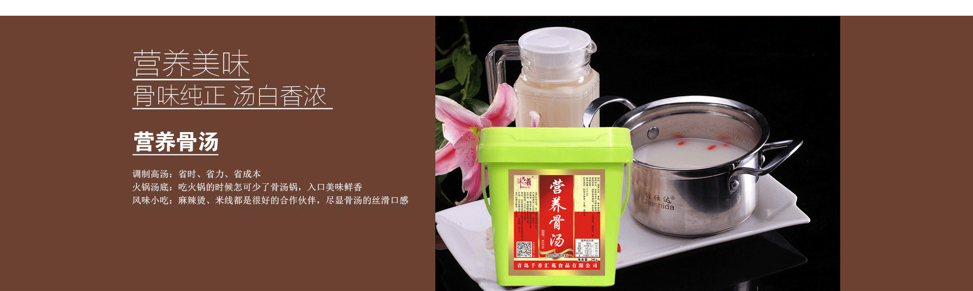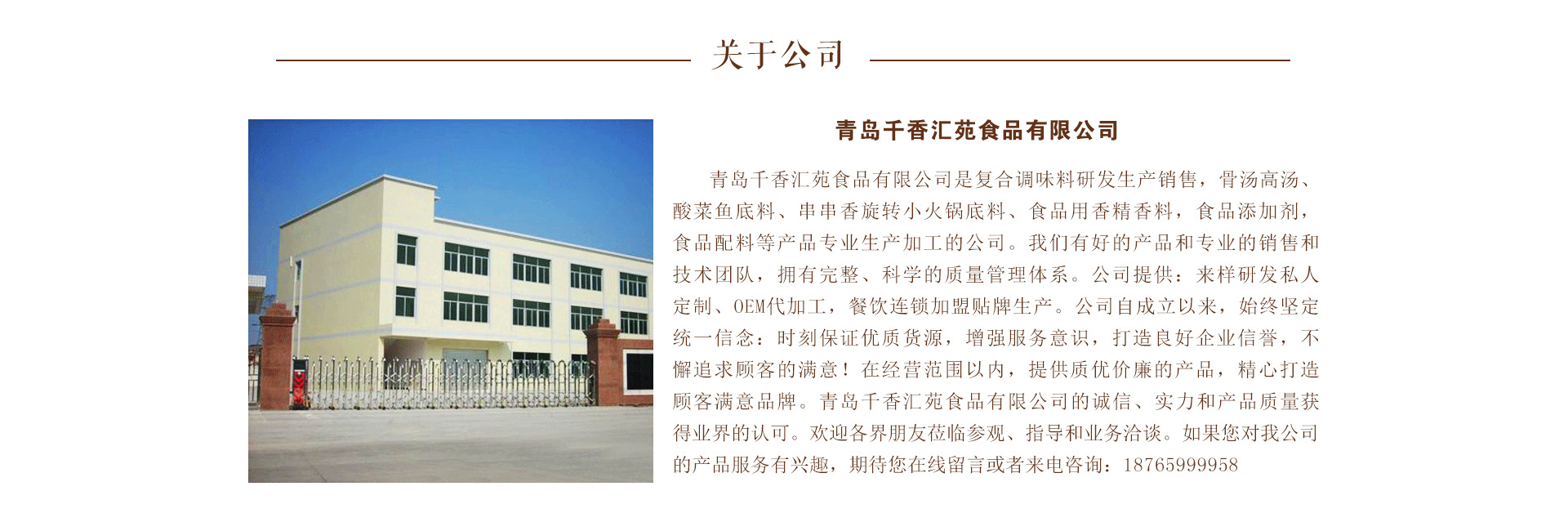 味曦工廠承接代加工貼牌,底料定向研發,味曦品牌加盟,餐飲管理咨詢。 幫廚食品調味料 咨詢電話:18765 9999 58 味曦餐飲管理理念,量身定做 火鍋調料,本公司自有工廠,研發團隊實力雄厚,歡迎全國老 板成噸拿貨代理,歡迎咨詢,支持客戶實地驗廠,實力品質保證! 青島千香匯苑食品有限公司是一家經營復合調味料的研發生產以及銷售的公司,公司主要經營:骨湯高湯、酸菜魚底料、串串香旋轉小火鍋底料、火鍋蘸料、腌制料鹵制料、食品用香精香料,食品添加劑,食品配料等產品。我們有好的產品以及專業的銷售和技術團隊,擁有完整、科學的質量管理體系。公司提供:來樣研發私人定制、OEM代加工,餐飲連鎖加盟貼牌生產。公司自成立以來,始終秉承著時刻保證優質貨源,增強服務意識,打造良好的企業信譽,不懈追求讓客戶的滿意的宗旨!在經營范圍以內,提供好的產品,精心打造顧客滿意品牌。青島千香匯苑有限公司用誠信