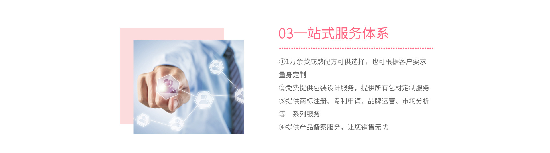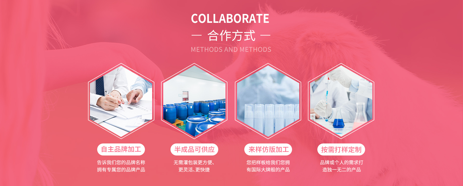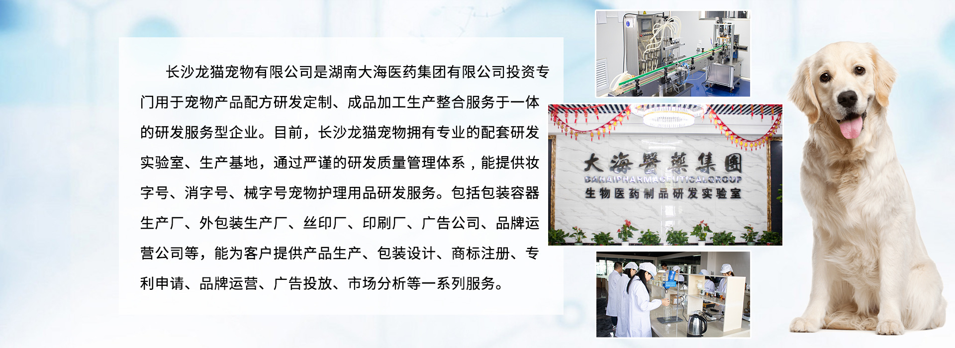 長沙龍貓寵物有限公司(以下簡稱:龍貓)是湖南大海醫藥集團有限公司(以下簡稱:大海集團)投資專門用于寵物產品配方研發定制、成品加工生產整合服務于一體的研發服務型企業。目前,龍貓擁有專業的配套研發實驗室、生產基地,通過嚴謹的研發質量管理體系﹐能提供寵物皮膚病藥品、寵物內外驅蟲藥品、寵物洗護沐浴用品、寵物營養保健品、寵物抑菌除臭用品等多樣化產品的研發服務。 龍貓以寵物用品、食品、保健品、藥品研發創新為基礎,以OEM代加工服務為依托,以整合上下游研發生產資源為拓展,以人力資源為根本,在激烈的市場競爭中得到廣大委托代加工品牌客戶的信賴與支持。龍貓擁有穩定優質的配套合作伙伴,包括包裝容器生產廠、外包裝生產廠、絲印廠、印刷廠、廣告公司、品牌運營公司等,能為客戶提供配方研發、產品生產、包裝設計、商標注冊、專利申請、品牌運營、廣告投放、市場分析等一系列優質配套服務。