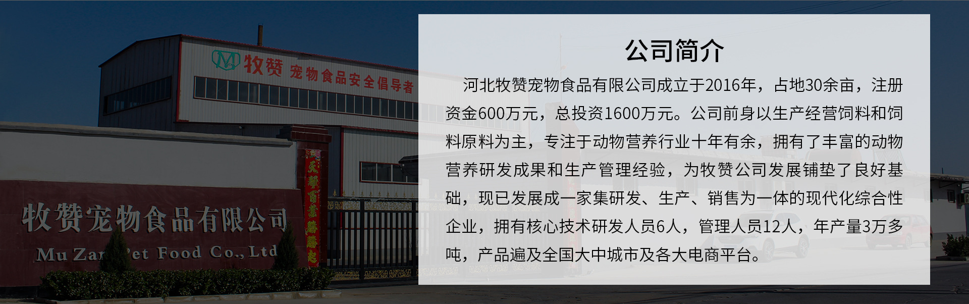 河北牧贊寵物食品有限公司成立于2016年,占地30余畝,注冊資金600萬元,總投資1600萬元。公司前身以生產經營飼料和飼料原料為主,專注于動物營養行業十年有余,擁有了豐富的動物營養研發成果和生產管理經驗,為牧贊公司發展鋪墊了良好基礎,現已發展成一家集研發、生產、銷售為一體的現代化綜合性企業,擁有核心技術研發人員6人,管理人員12人,年產量3萬多噸,產品遍及全國大中城市及各大電商平臺。 公司自成立以來始終堅持“糧材好,糧才好”的原則,嚴守“以質量求生存,食品安全第一”的方針為客戶服務,貫穿落實“臻于至善,誠實守信”為己任。以感恩為核心理念,以讓更多人獲得企業發展紅利為目標,在公司內部推行合作制,打造平臺化企業,實現跨越式發展。 牧贊是一個年輕的企業,是一直朝氣蓬勃的團隊。在今后的工作中,我們會用更加優質的產品感恩社會、回饋社會,為行業做出積極的貢獻。