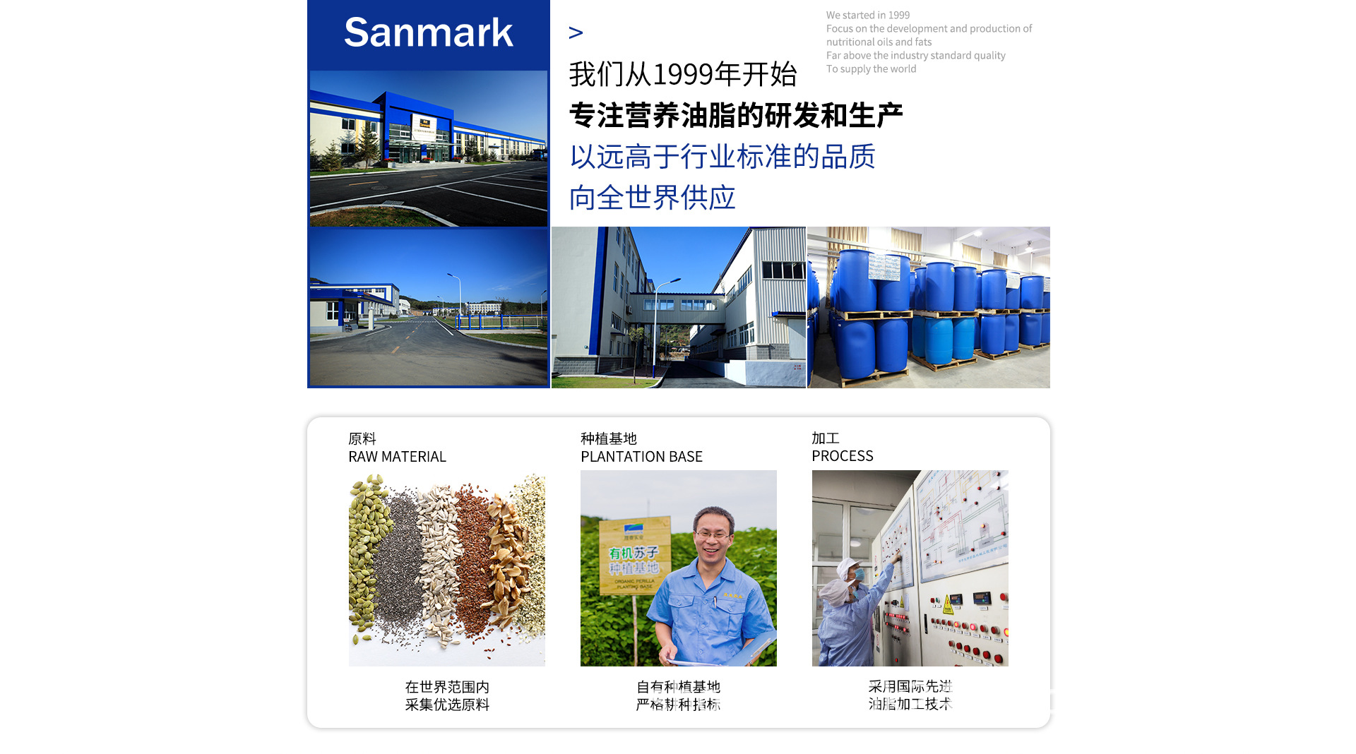 自有70000平米生產基地,自有有機種植基地,20年出口品質;歐盟生產標準,出口全球40多個國家和地區,服務200家企業;全球第一個通過GMP認證的油脂企業;十項國際認證