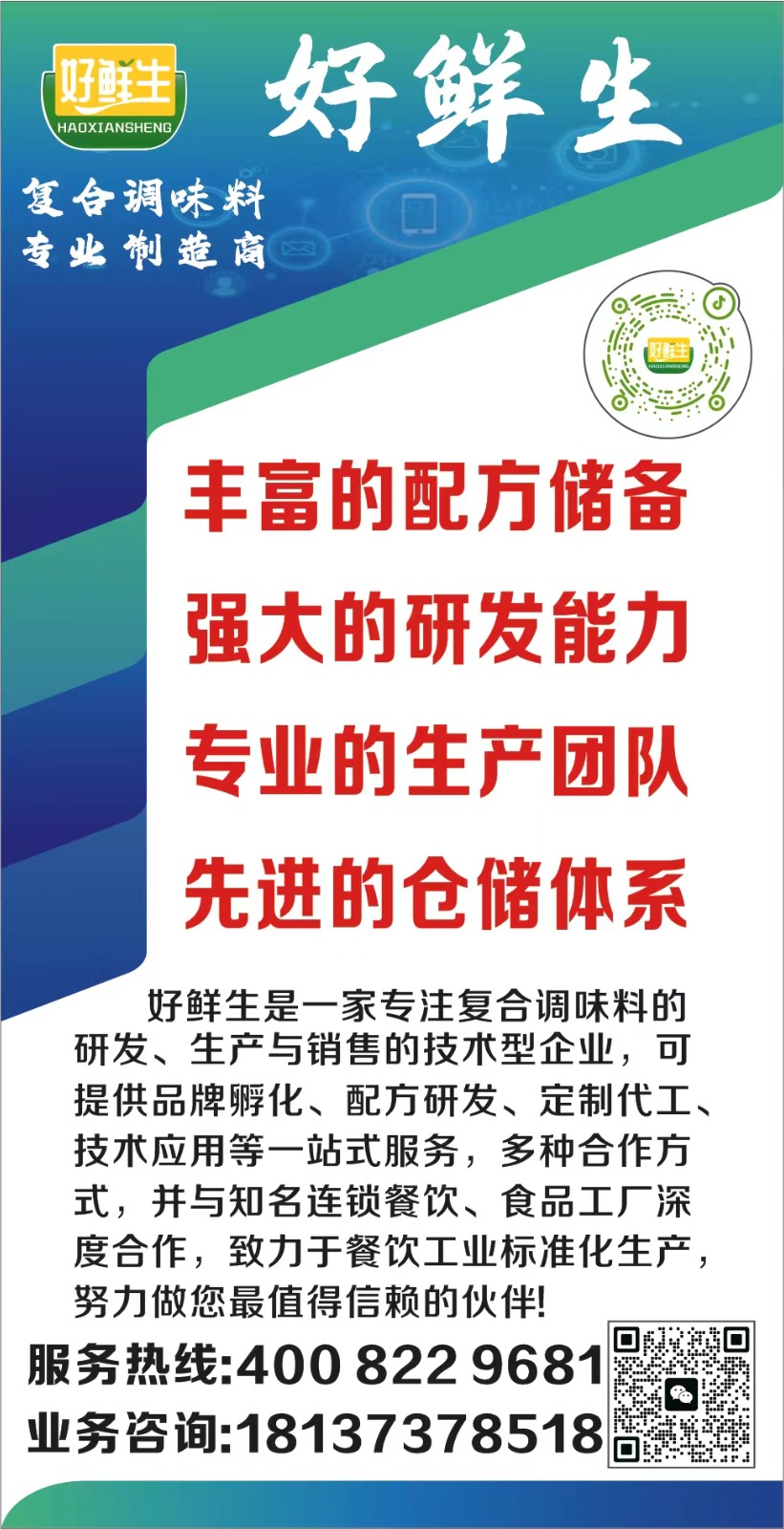 好鮮生是一家專注復合調味料的研發、生產與銷售的技術型企業,可提供品牌孵化、配方研發、定制代工技術應用等一站式服務,多種合作方式,并與知名連鎖餐飲、食品工廠深度合作,致力于餐飲工業標準化生產努力做您最值得信賴的伙伴!