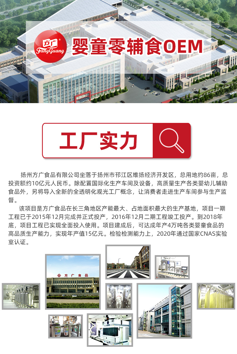 揚州方廣食品有限公司于2015年簽約落戶,2016年廠房竣工產線投產,打造成為國內首座嬰幼兒專業輔食觀光工廠、10萬級凈化車間;江蘇首個嬰幼兒谷物輔助食品嬰輔工廠,獲得揚州首張嬰幼兒谷物輔助食品SC證。揚州工廠總用地約86畝,總投資額約10億元人民幣,可達成年產4萬噸各類嬰童食品的高品質生產能力,實現年產值15億元。