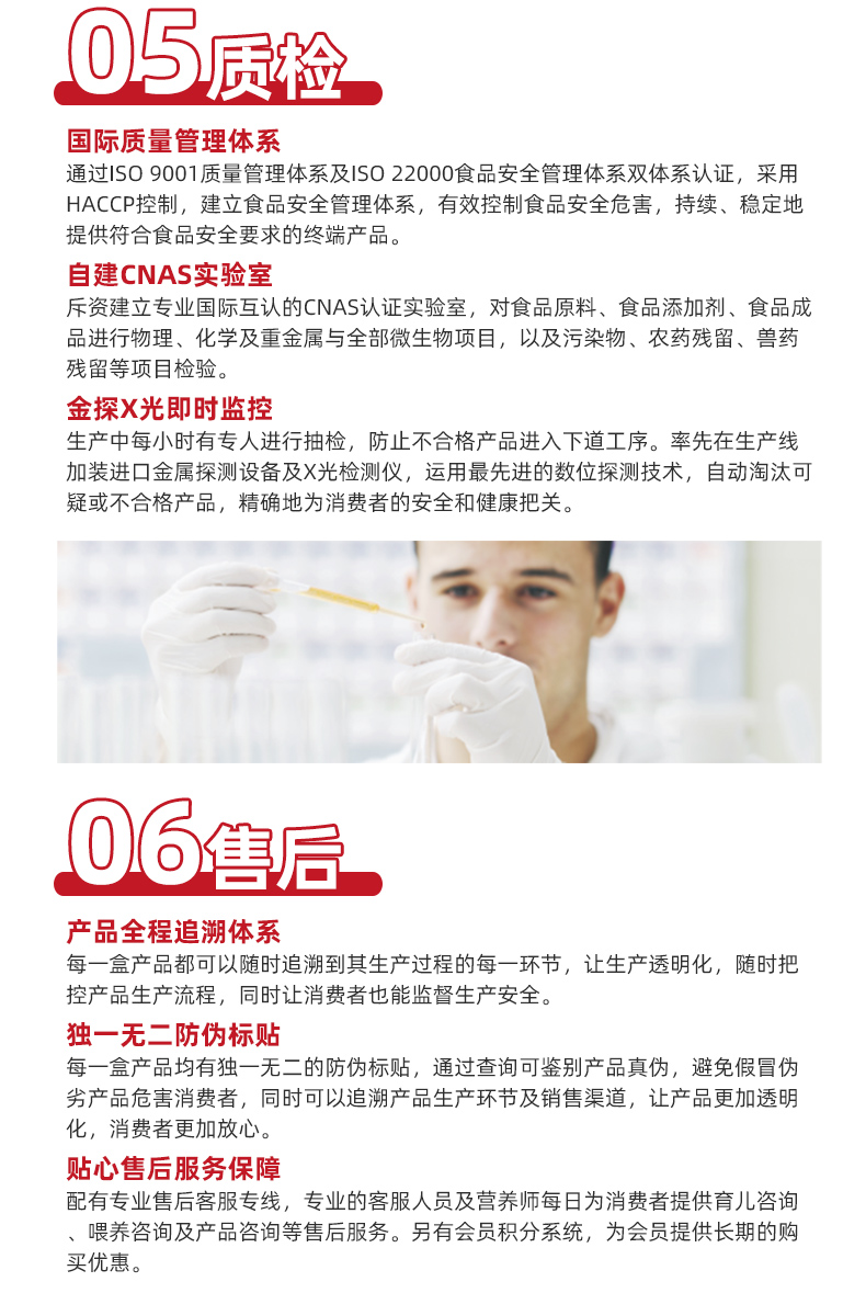 2017年建成的揚州工廠新增多條產線,采用現代化管理體系,通過了ISO雙體系認證;投資6000千多萬元建成的面積3千多平米食品檢測中心,實現了全項目檢驗,并于2020年通過了國家認監委CNAS實驗室認證。