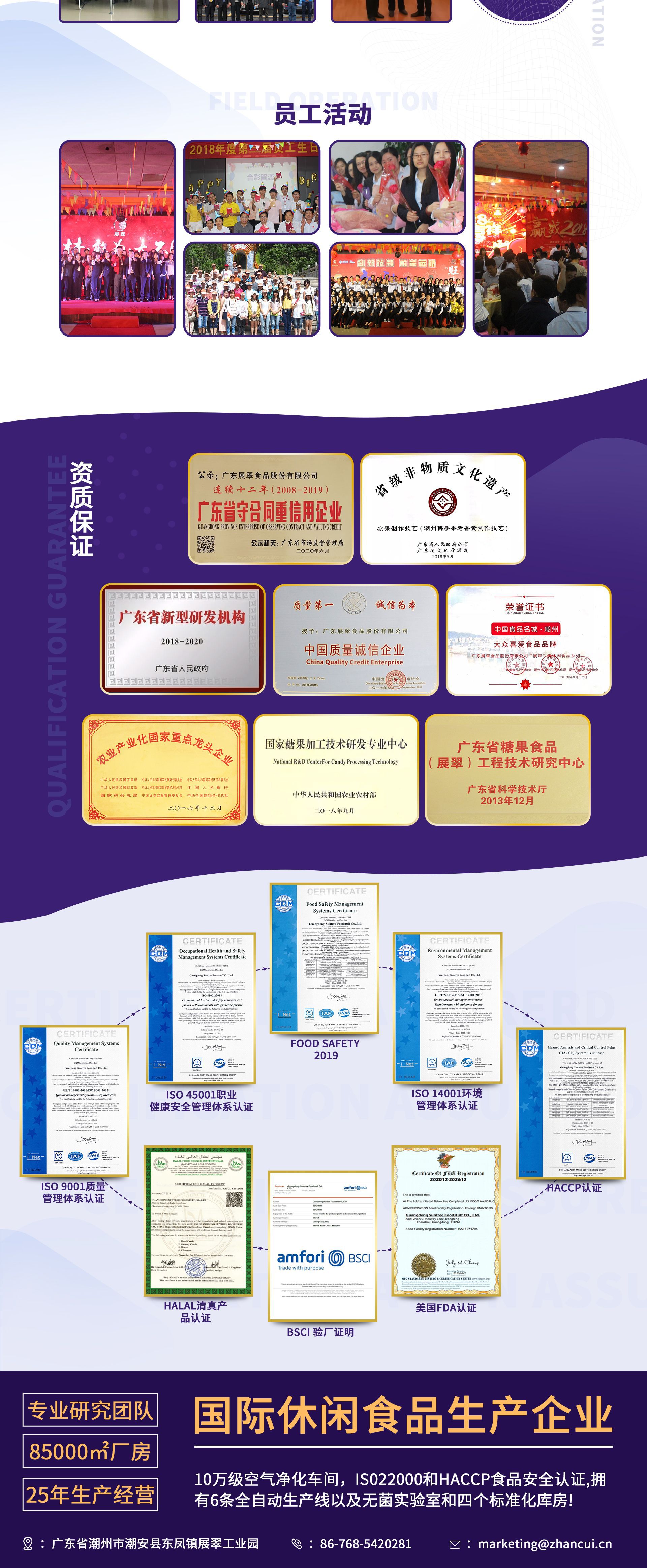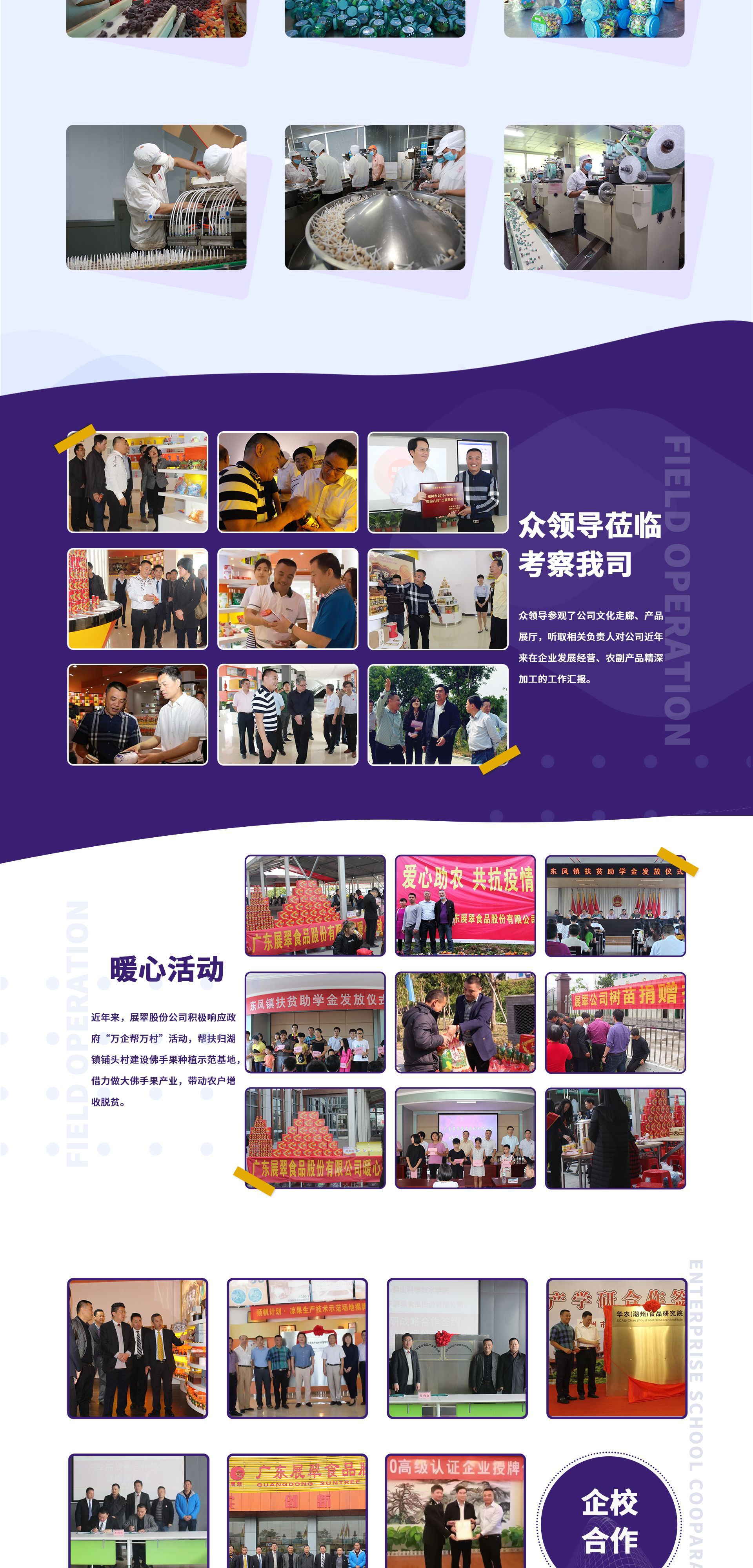 廣東展翠食品股份有限公司位于“中國食品名城”——廣東省潮州市。公司創(chuàng)建于1996年,占地85000 m2,24年的堅守耕耘,現(xiàn)已發(fā)展成為年銷售額過百億的一家專門從事休閑食品研發(fā)、深加工、倉儲、物流以及國內(nèi)外營銷的綜合型高新技術(shù)企業(yè)。 公司一貫堅持“質(zhì)量為本,客戶至上”的經(jīng)營理念,樹立以“誠信”為核心的企業(yè)文化,視消費者食品安全為己任,始終把產(chǎn)品質(zhì)量放在首位,建立風險預(yù)防管理機制,實施食品安全的全方位控制,確保產(chǎn)品質(zhì)量與安全。 公司通過自主研發(fā)、引進技術(shù)、合作開發(fā)等方式,依托“國家糖果加工技術(shù)研發(fā)專業(yè)中心”的技術(shù)力量,不斷推出一系列多元多樣的健康食品,公司旗下的軟硬糖果、糕點點心、餅干膨化、果干蜜餞、方便速食等產(chǎn)品系列,品種達200多個,暢銷國內(nèi)各大省市, 遠銷美國、加拿大、澳大利亞、韓國、日本等海外80多個國家和地區(qū)。為消費者帶去質(zhì)高、價優(yōu)、新鮮、豐富、便利的快樂零食。