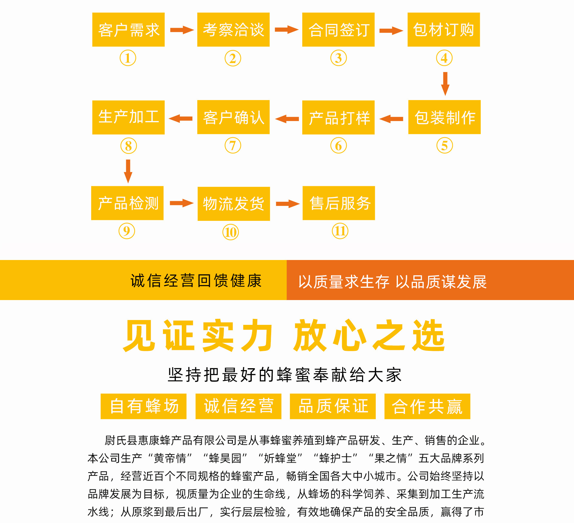 尉氏縣惠康蜂產品有限公司是已加集養殖、生產、產品研發、銷售的企業。公司堅持以品牌發展為目標,視質量為企業生命線。公司始終立足于"以質量求生存,以信譽求發展”的宗旨,以“把滿意和放心交給每一個顧客”為經營理念,愿和蜂產品批發商、零售商建立長期、穩定的合作關系。