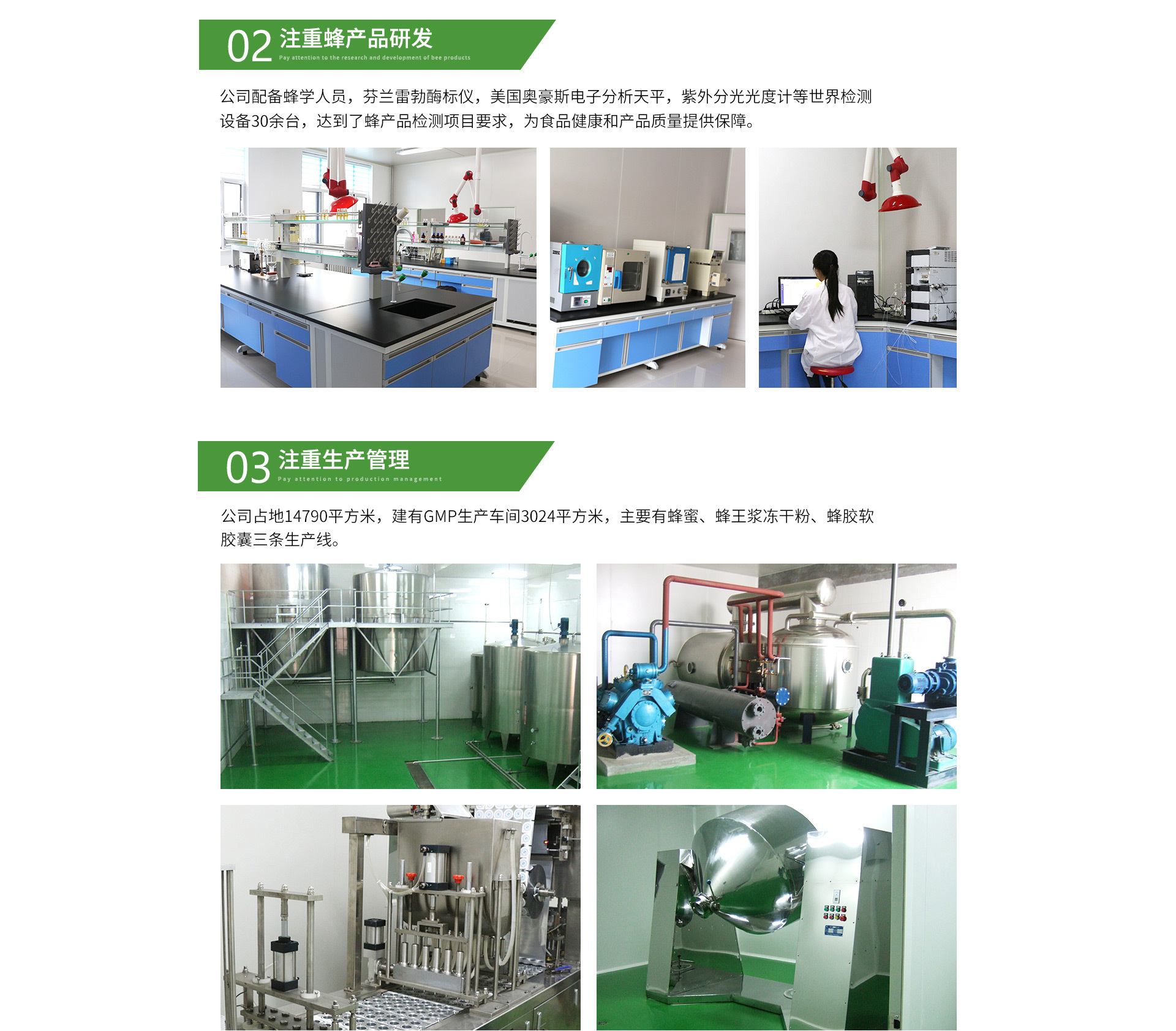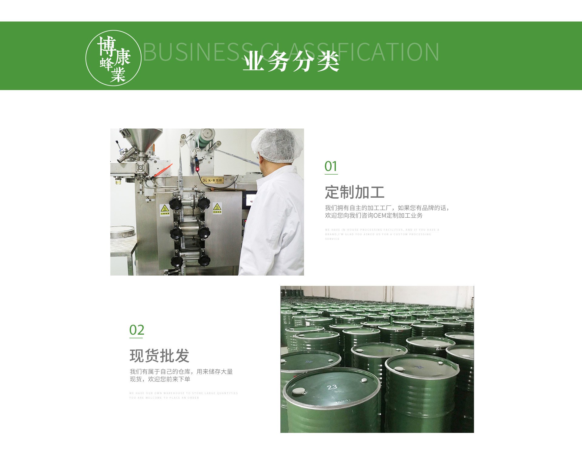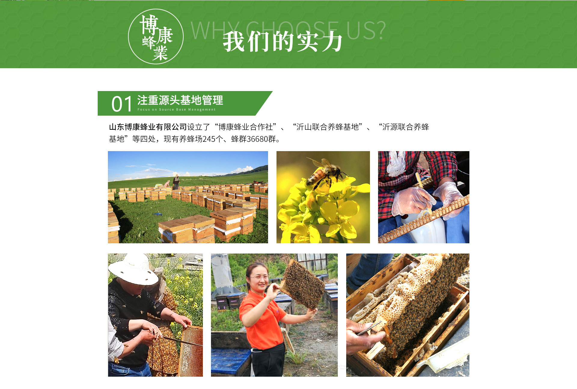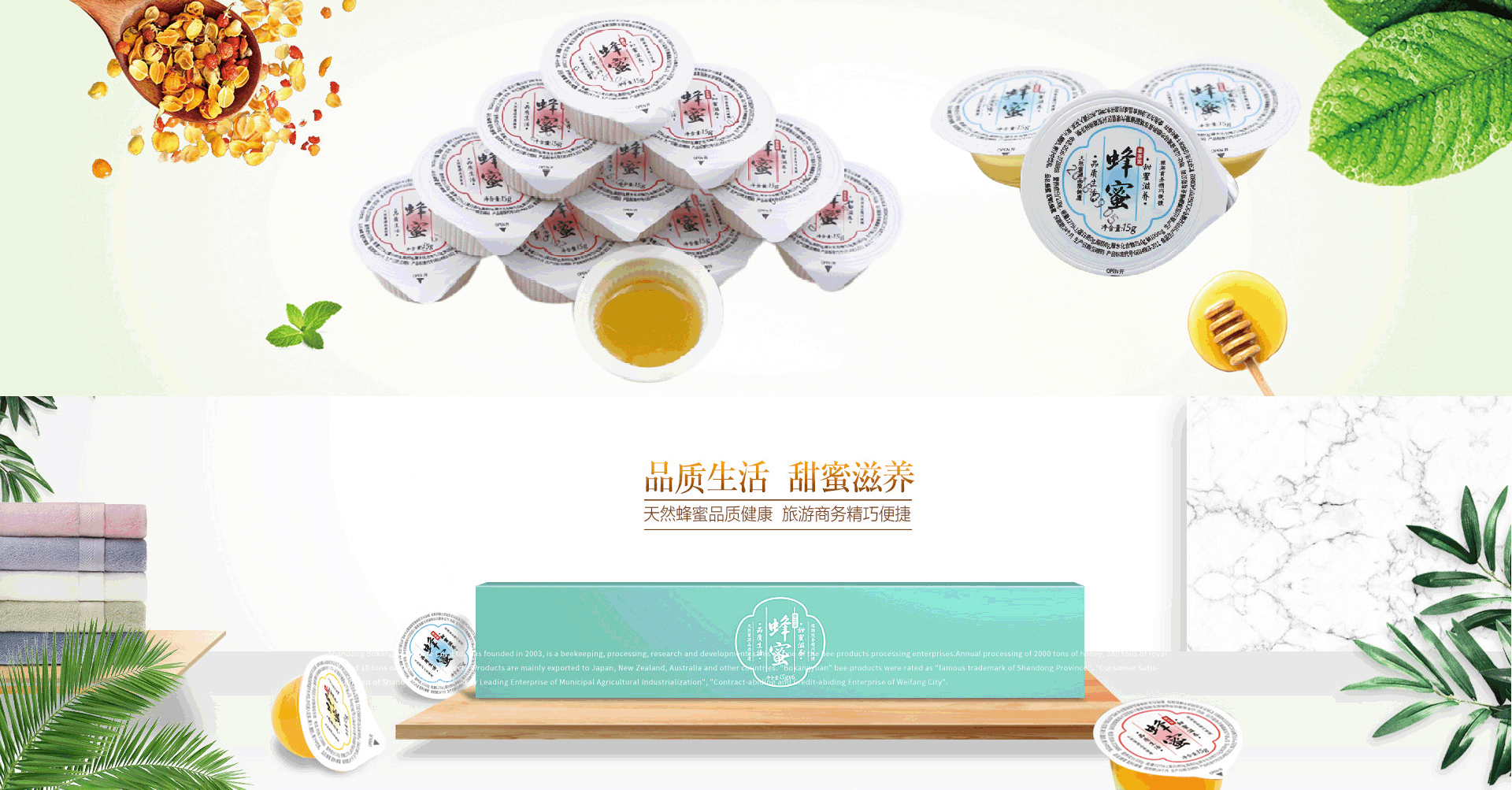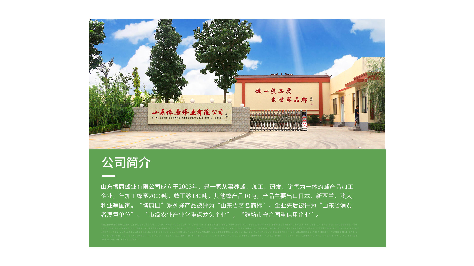 山東博康蜂業有限公司公司成立于2003年,座落于國家5A級森林公園-沂山腳下。專業從事養蜂、加工、研發、銷售為一體的蜂產品加工企業。占地14790㎡,建有符合GMP要求的生產車間3024㎡,擁有專業技術人員32人,并成立了博康蜂業專業合作社 ,設有“沂山聯合養蜂基地”,“沂源聯合養蜂基地”,“魯山自屬養蜂基地”。現有養蜂場245個、蜂群36680群。年加工蜂蜜2000噸,年加工蜂王漿180噸,其他蜂產品(蜂花粉、蜂膠、蜂蠟、雄蜂蛹、王漿幼蟲等)10噸,產品遠銷日、新西蘭、澳大利亞等國家。 公司通過了SC認證;食品出口衛生認證;ISO9001:2015和HACCP質量體系認證及《采用國際標準產品標志證書》和《企業產品采用國際標準確認可證》,建立符合蜂產品檢測要求的研發中心一處,為保證食品安全和產品質量提供了可靠保障,山東博康蜂業有限公司歡迎您來參觀考察。