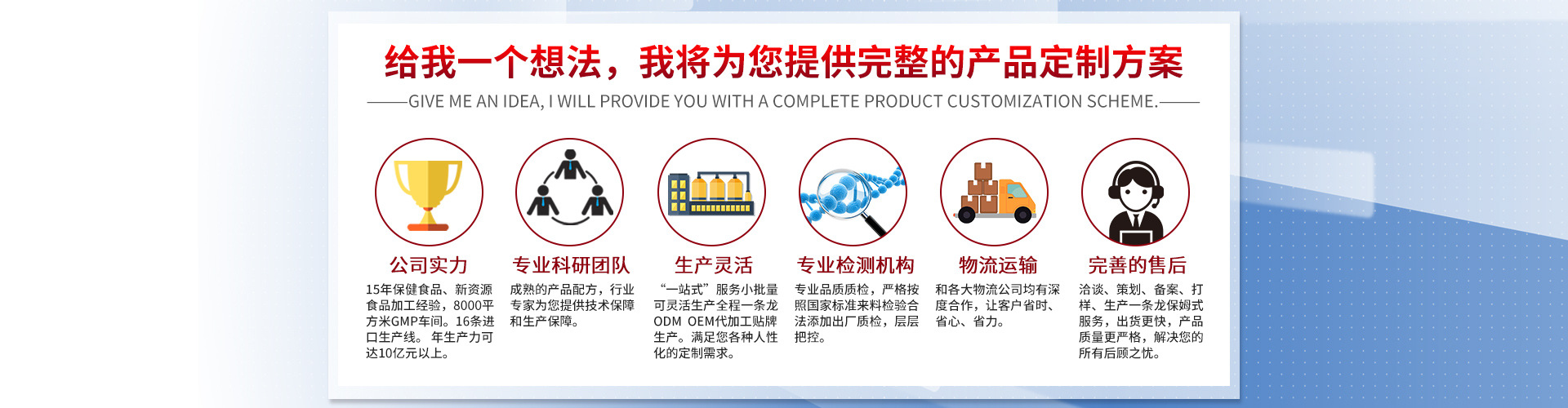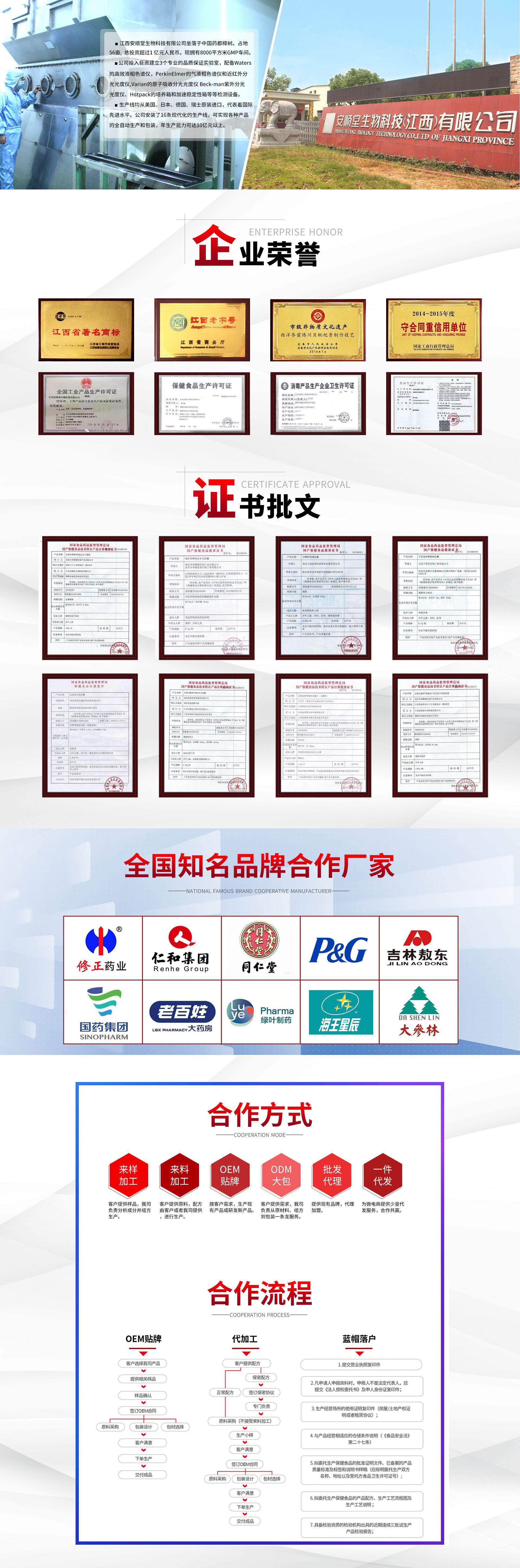 江西安順堂生物科技有限公司成立于2005年,一直致力研究開發生產保健食品及外用產品,有32個藍帽批文400多個品種,工廠生產基地占地6.6萬平方米,總投資超過1億元人民幣。公司生產線均從歐美、日本、瑞士等地原裝進口,安裝了16條現代化生產線。包括先進的片劑、粉劑、膠囊、口服液的全自動生產線及自動包裝線。