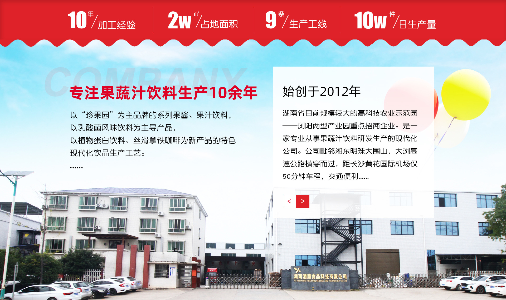 我公司為湖南省目前規模較大的高科技農業示范園——瀏陽兩型產業園重點招商企業。是一家專業從事果蔬汁飲料研發生產的現代化公司,毗鄰湘東明珠大圍山,大瀏高速公路橫穿而過,距長沙黃花國際機場僅50分鐘車程,交通便利,地理位置優越。占地面積12000平方米,其中生產廠房8000平方米,現代化專業庫房3000平方米,研發試驗室500平方米。目前有10條全自動生產流水線,檢測化驗設施齊備、檢測手段完善,所有系列產品年生產能力均上萬噸。主要研發生產的產品有:果醬、功能性飲料、蛋白飲料(豆奶、核桃奶、花生奶等)、果汁飲料、果粒飲料、及其他飲料。在食品原輔材料儲存區域、水處理、原漿、灌裝車間等采取多重安全設施,保證產品質量在各個環節上的穩定性和可靠性,并且引進飲品行業專業人才做產品工藝研發,為高品質的產品提供了有力的保證。