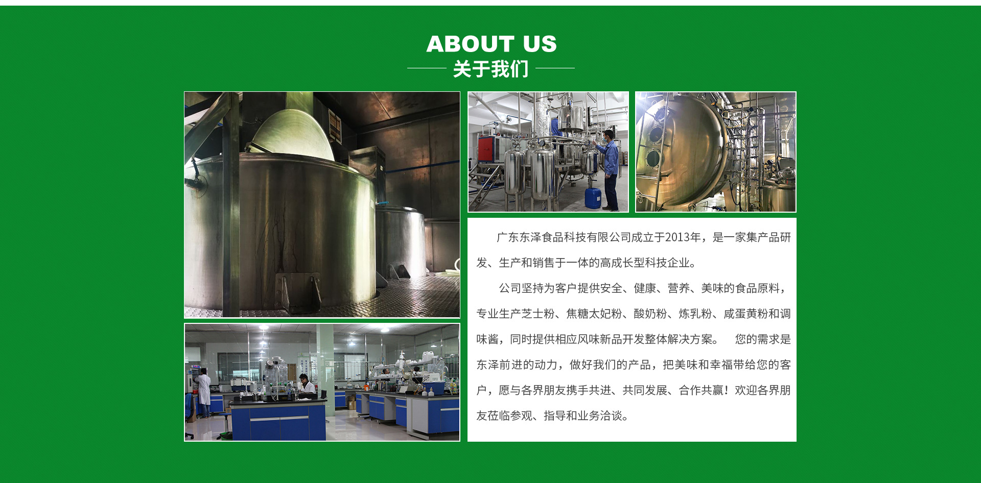 廣東東澤食品科技有限公司成立于2013年,是一家集產品研發、生產和銷售于一體的高成長型科技企業。公司堅持為客戶提供安全、健康、營養、美味的食品原料,專業生產芝士粉、焦糖太妃粉、酸奶粉、煉乳粉、咸蛋黃粉、奶油粉和調味醬,同時提供相應風味新品開發整體解決方案。 您的需求是我們前進的動力,做好我們的產品,把美味和幸福帶給您的客戶,愿與各界朋友攜手共進、共同發展、合作共贏!歡迎各界朋友蒞臨參觀、指導和業務洽談。