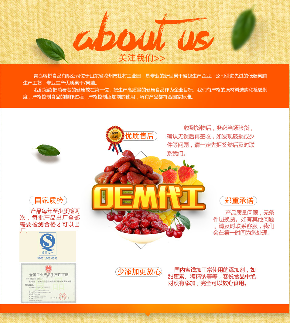 青島容悅食品有限公司成立于2007年,是一家專業(yè)的果干蜜餞生產(chǎn)廠家。產(chǎn)品采用科學(xué)的工藝,鮮果制作,不漂泊不硬化,添加劑的使用少之又少,嚴(yán)格按照國家標(biāo)準(zhǔn)生產(chǎn)。目前以散貨為主,也為眾多電商提供貼牌分裝。產(chǎn)品品類多,質(zhì)量好,價格公道。14年老廠,值得信賴
