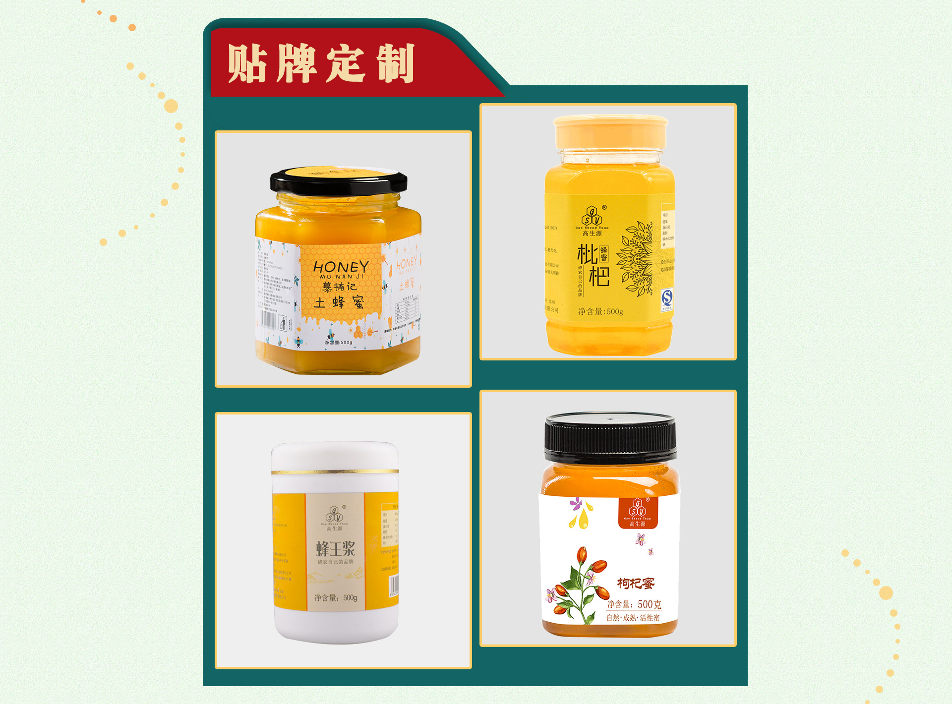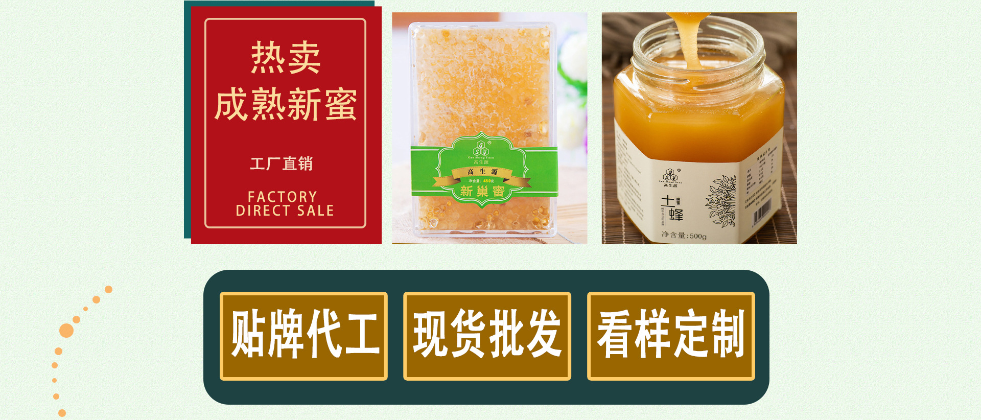 安徽省高生源蜂業有限公司企業簡介: 高生源蜂業蜂業有限公司位于池州市,整個城市環境優美,無化工生產企業,無污染;毗鄰長江青山綠水,非常適宜設置食品生產企業加工生產,公司主產“高生源”牌蜂蜜、蜂王漿、蜂花粉等系列產品,擁有自主知識產權的蜜蜂養殖基地,蜂產品開發等專業技術的樅陽縣蜜蜂科學研究所;公司依托研究所擁有公司加農戶加基地的經驗模式,滾動式發展,目前公司已發展重點養蜂戶300戶,蜂群15000箱,年蜂蜜產量達350噸,蜂王漿10噸,花粉8噸,蜂膠1噸,產品完全走產供銷一體化之路,銷往全國各地,以優良的產品質量,優質的服務,奉獻給廣大客戶。 高生源品牌先后榮獲安徽省民營科技企業,安徽省旅游商品定點生產企業,安慶市知名商標,并榮獲2014年縣級龍頭企業一等獎,2015年獲得市級龍頭企業稱號,2016年獲得315頒發的互聯網信得過企業。