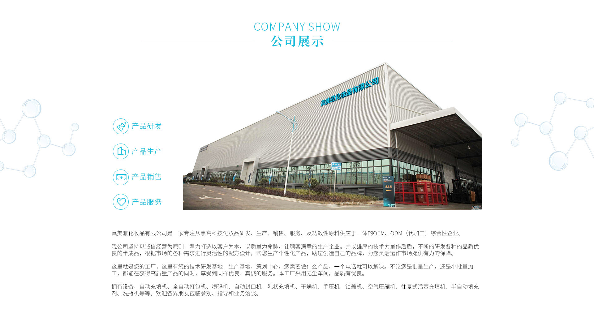 真美雅化妝品有限公司是一家專注從事高新技術(shù)化妝品研發(fā)、生產(chǎn)、銷售、服務(wù)及功效性原料一體的OEM、ODM(代加工)綜合性企業(yè)。我公司堅(jiān)持以誠信經(jīng)營為原則,著力于打造以客戶為本,以質(zhì)量為命脈,讓客戶滿意的生產(chǎn)企業(yè)。并以雄厚的技術(shù)力量作后盾,不斷研發(fā)各種品質(zhì)優(yōu)良的化妝品半成品,根據(jù)市場(chǎng)的各種需求進(jìn)行靈活性的配方設(shè)計(jì),幫您生產(chǎn)個(gè)性化產(chǎn)品,助您創(chuàng)造自己的品牌,為您靈活運(yùn)作市場(chǎng)提供有力的保障。 這里就是您的工廠,這里有您的技術(shù)研發(fā)基地,生產(chǎn)基地,策劃團(tuán)隊(duì),您需要什么產(chǎn)品,一個(gè)電話就可以解決。不論您是批量生產(chǎn),還是小批量加工,都能再獲得高質(zhì)量產(chǎn)品的同時(shí),享受到同樣優(yōu)良、真誠的服務(wù)。 本工廠擁有自動(dòng)填充機(jī)、全自動(dòng)打包機(jī)、噴碼機(jī)、自動(dòng)封口機(jī)、乳狀充填機(jī)、干燥機(jī)、手壓機(jī)、鎖蓋機(jī)、空氣壓縮機(jī)、往復(fù)式活塞填充機(jī)、半自動(dòng)填充機(jī)、洗瓶機(jī)等等。歡迎各界朋友參觀、指導(dǎo)和業(yè)務(wù)洽談。