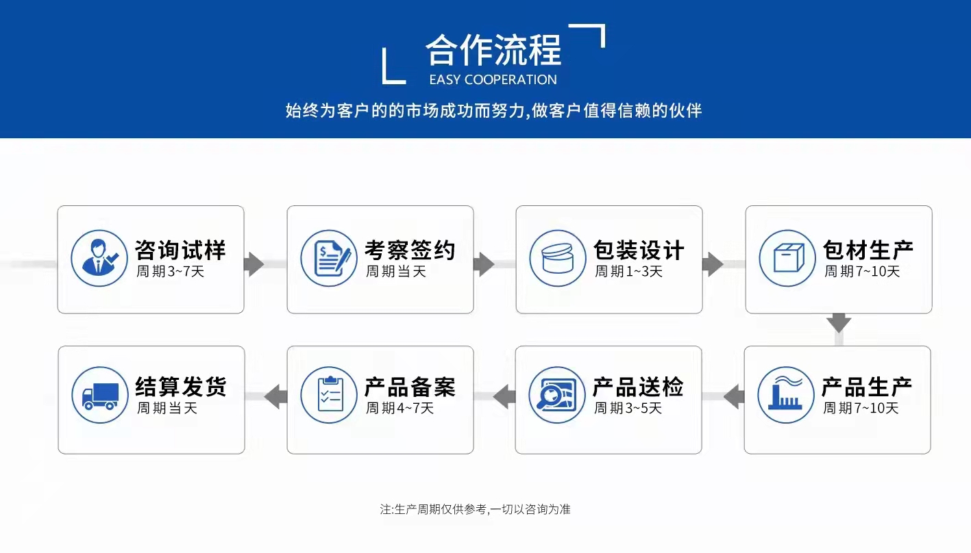 我司提供從包材設計/定制、配方研發、生產加工等一整套服務,助你在最快的時間,輕松無憂的擁有您自己的品牌。