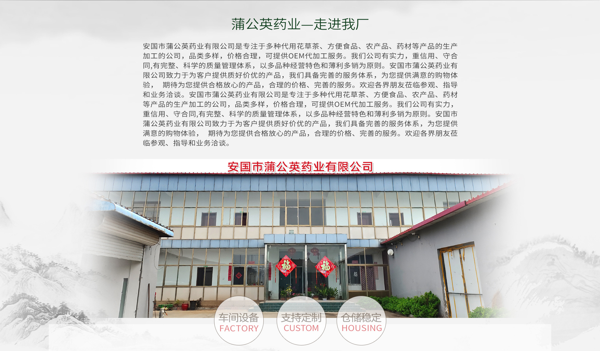 安國市蒲公英藥業(yè)有限公司 本公司是專注于各種代用花草茶、方便食品、農(nóng)產(chǎn)品、中藥材等產(chǎn)品的生產(chǎn)加工的公司,品類齊全,價格合理,可提供OEM貼牌代加工服務(wù)。我們公司實力雄厚,重信用、守合同,擁有完整、科學的質(zhì)量管理體系來保證產(chǎn)品質(zhì)量,以多品種經(jīng)營特色和薄利多銷的原則,贏得了廣大客戶的信任。安國市蒲公英藥業(yè)有限公司致力于為客戶提供質(zhì)好價優(yōu)的產(chǎn)品,我們具備得天獨厚的優(yōu)勢和完善的服務(wù)體系,為您提供滿意的購物體驗, 期待為您提供合格放心的產(chǎn)品,合理的價格、完善的服務(wù)。歡迎各界朋友蒞臨參觀、指導(dǎo)和業(yè)務(wù)洽談
