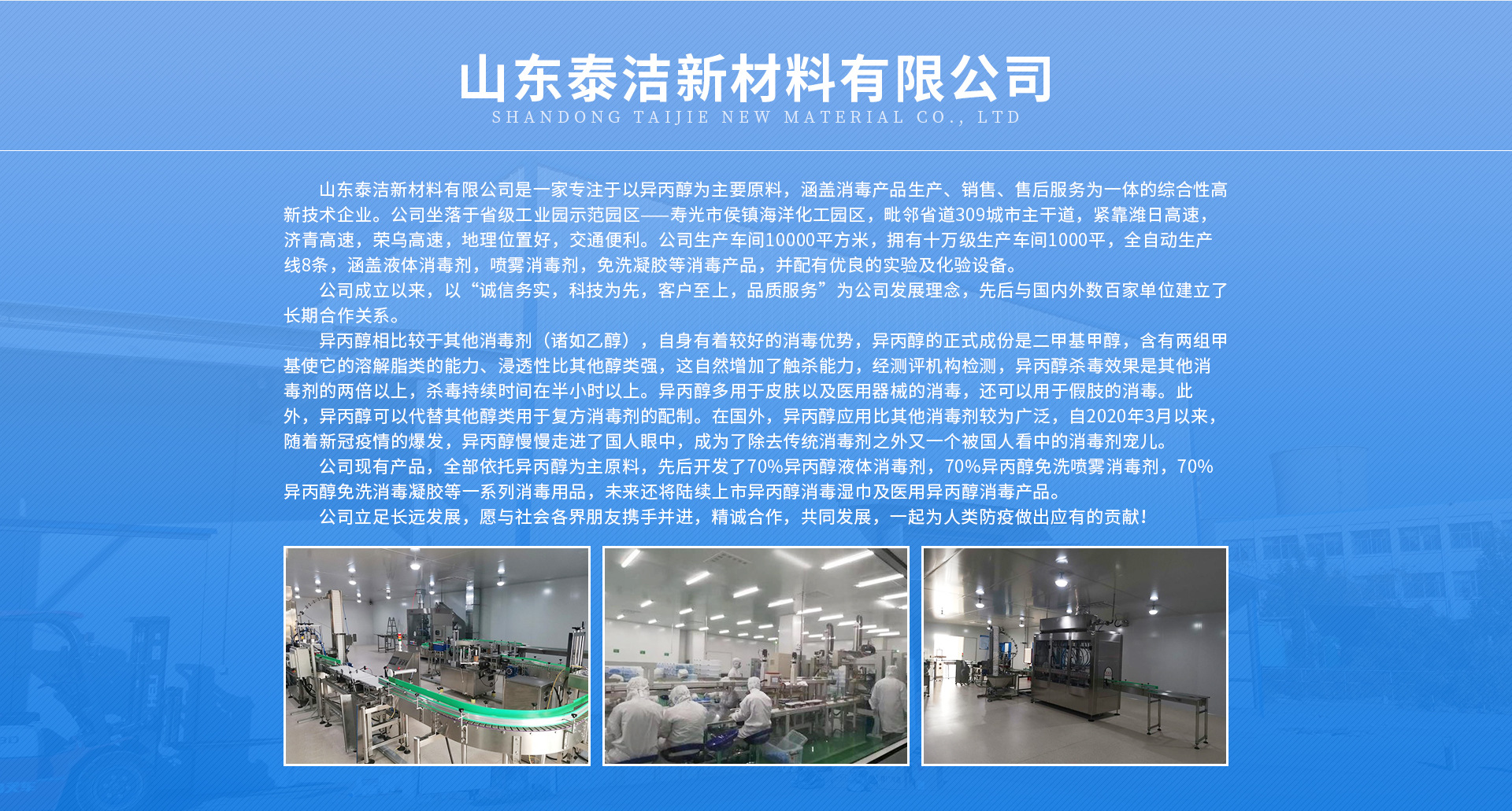 山東泰潔新材料有限公司是一家專注于以異丙醇為主要原料,涵蓋消毒產(chǎn)品生產(chǎn)、銷售、售后服務為一體的綜合性高新技術(shù)企業(yè)。公司坐落于省級工業(yè)園示范園區(qū)——壽光市侯鎮(zhèn)海洋化工園區(qū),毗鄰省道309城市主干道,緊靠濰日高速,濟青高速,榮烏高速,地理位置好,交通便利。公司生產(chǎn)車間10000平方米,擁有十萬級生產(chǎn)車間1000平,全自動生產(chǎn)線8條,涵蓋液體消毒劑,噴霧消毒劑,免洗凝膠等消毒產(chǎn)品,并配有優(yōu)良的實驗及化驗設備。