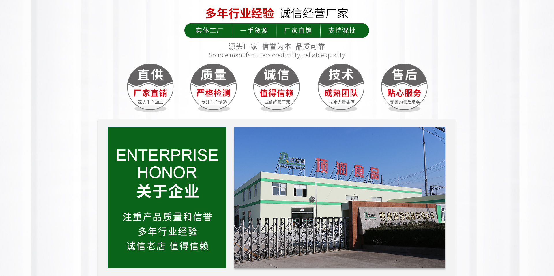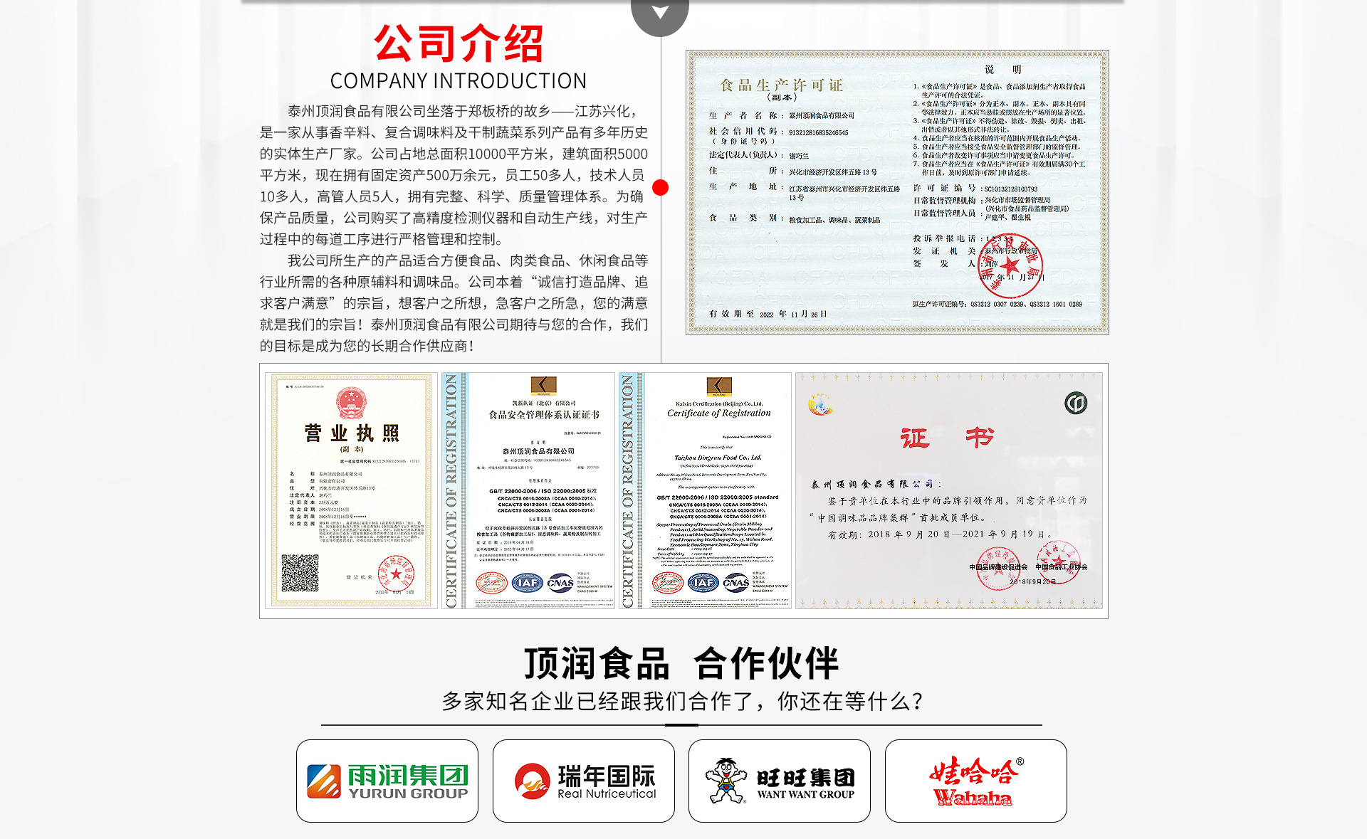 我公司位于鄭板橋故鄉——興化,是一家從事香辛料,復合調味料及干制蔬菜系列產品有多年歷史的專業生產廠家。公司占地總面積16800平方米,建筑面積10000平方米,現在擁有固定資產500萬元,員工50多人,專業技術人員10人,高管人員5人,擁有完整、科學、質量管理體系,為保障產品質量,公司購買了高精度檢測儀器和自動生產線,對生產過程中的每道工序進行嚴格管理和控制。我公司所生產的產品適合方便食品、肉類食品、休閑食品等行業所需的各種原輔料和調味品。公司本著“誠信打造品牌、追求客戶滿意”的宗旨,期待與您的合作,我們的目標是成為您的長期供應商!