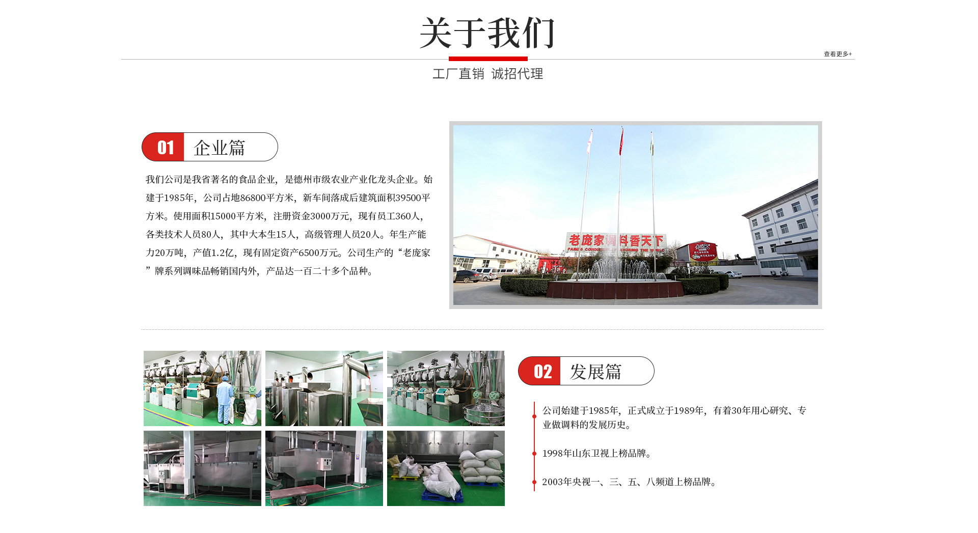 山東龐大調味食品有限公司是我省著名的優秀企業,是德州市級農業產業化龍頭企業。始建于1985年,公司占地86800平方米,新車間落成后建筑面積39500平方米。使用面積15000平方米,公司注冊資金3000萬元,現有員工360人,各類技術人員80人,其中大本生15人,高級管理人員20人。年生產能力20萬噸,產值1.2億,現有固定資產6500萬元。公司生產的“老龐家”牌系列調味品暢銷國內外,產品達一百二十多個品種。2011月3月以會長單位成立“樂陵市工商聯恒信企業互助商會”,一流的產品質量,誠信務實的企業理念,雄厚的技術力量,較高的管理水平,深受國內外廣大客戶的良好贊譽。