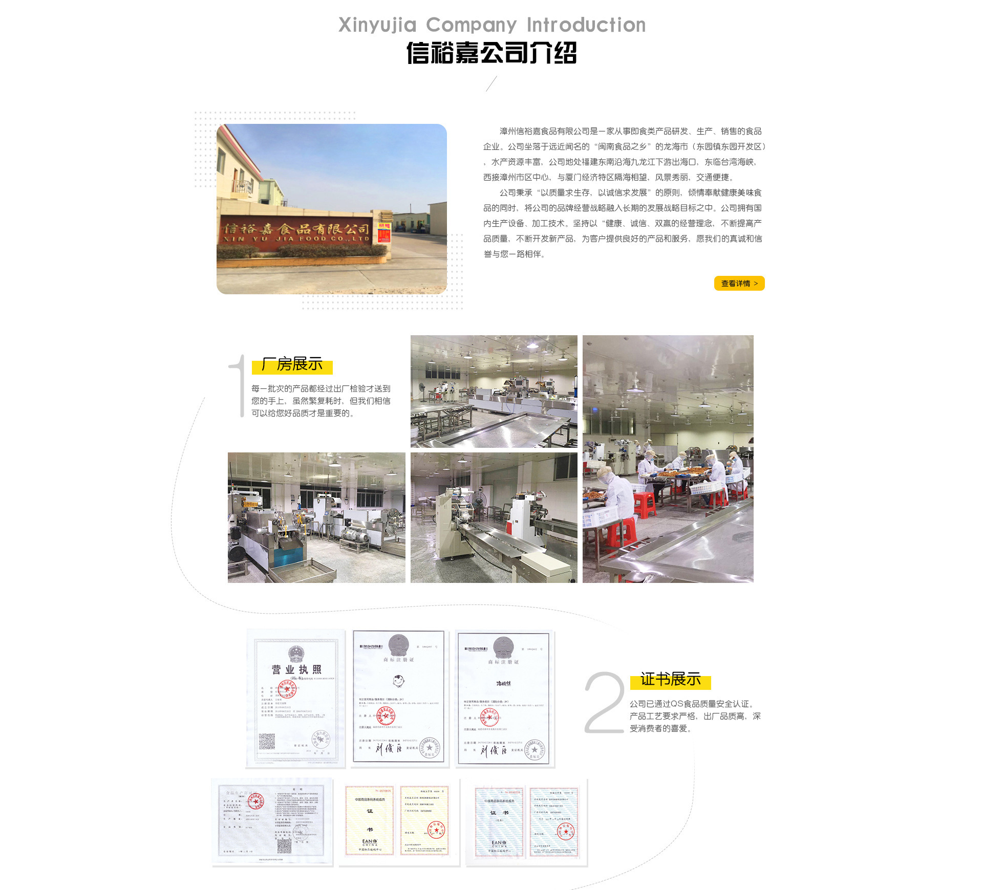 漳州信裕嘉食品有限公司是一家知名的休閑食品生產企業。公司憑借好的設備,完善的管理,完善的技術,很早就通過qs食品質量安全認證。產品選材要求高、工藝要求嚴格,產品出廠品質高,深受消費者的喜愛。另外公司擁有一大批人才,為企業發展共同奮斗。我們始終相信“質量是企業發展的根本,誠信是企業發展的動力”,我們會讓您相信選擇了我們就是選擇了美味,選擇了放心。