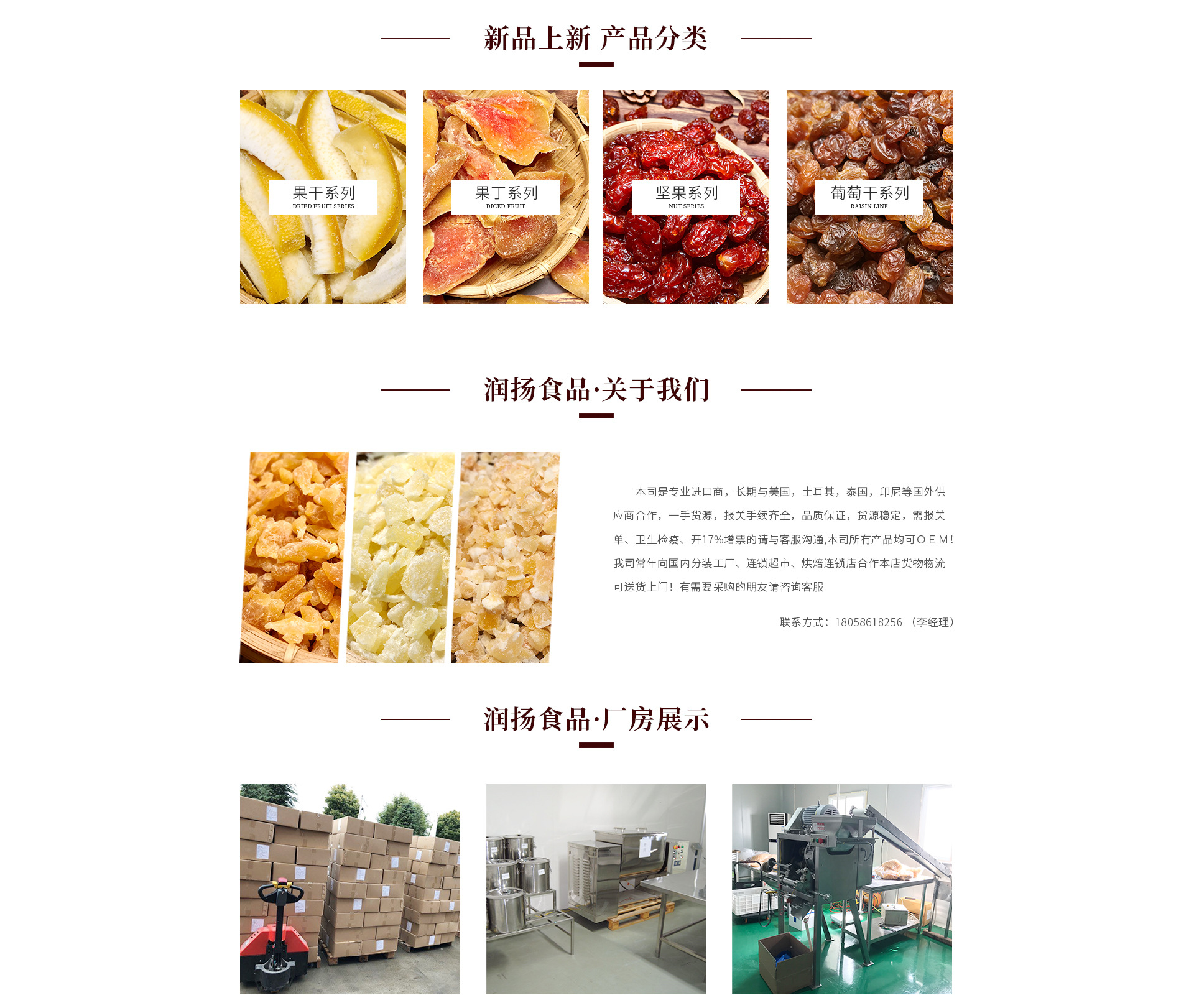 潤揚(yáng)食品(嘉善)有限公司是一家以果脯、果干、烘焙、糕點原料等產(chǎn)品專業(yè)生產(chǎn)加工的公司,擁有完整科學(xué)的質(zhì)量管理體系。 倡導(dǎo)純植物原生態(tài)健康自然的生活理念,品味最純正的果干味道,不添加色素,不添加香精,享受自然真果香,我們的產(chǎn)品原材料全球優(yōu)選,按照營養(yǎng),品質(zhì) 無添加劑,口感的次序,我們對供應(yīng)鏈的管理和從源頭執(zhí)行可追溯性的控制,我們專注在對原產(chǎn)國環(huán)境的垃圾選擇優(yōu)質(zhì)供應(yīng)商,我們有著十幾年的進(jìn)出口經(jīng)驗,以保證貨源。我們通過ISO9001;ISO22000認(rèn)證的分裝工廠’潤揚(yáng)食品(嘉善)、有限公司和嘉善糧緣食品有限公司,可以O(shè)EM和ODM,以滿足消費者的需求,潤揚(yáng)食品(嘉善)有限公司的誠信、實力和產(chǎn)品質(zhì)量獲得業(yè)界的認(rèn)可