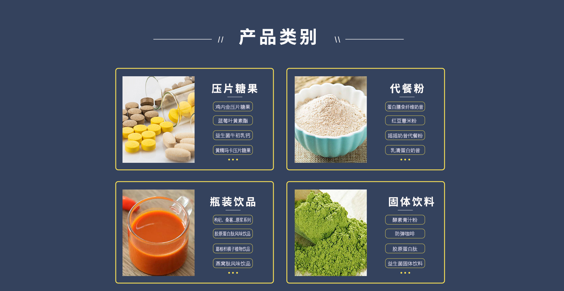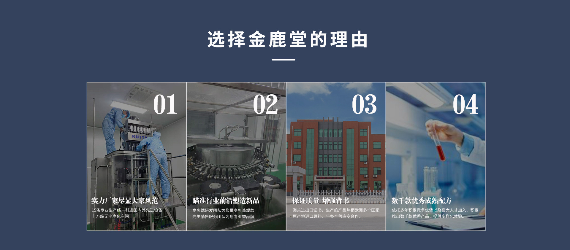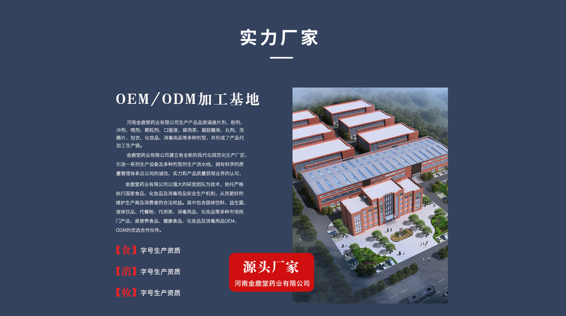 金鹿堂藥業(yè)有限公司生產(chǎn)產(chǎn)品品類涵蓋片劑、粉劑、沖劑、噴劑、顆粒劑、口服液、袋泡茶、凝膠糖果、丸劑、泡騰片、包衣、化妝品、消毒用品等多種劑型,并形成了產(chǎn)品代加工生產(chǎn)鏈。金鹿堂藥業(yè)有限公司建立有全新的現(xiàn)代化規(guī)范化生產(chǎn)廠區(qū),引進一系列生產(chǎn)設(shè)備及多種劑型的生產(chǎn)流水線,擁有科學(xué)的質(zhì)量管理體系且公司的誠信、實力和產(chǎn)品質(zhì)量獲得業(yè)界的認可,金鹿堂藥業(yè)有限公司以強大的研發(fā)團隊為技術(shù),依托嚴格執(zhí)行國家食品、化妝品及消毒用品安全生產(chǎn)機制,從而更好的維護生產(chǎn)商及消費者的合法權(quán)益。其中包含固體飲料,益生菌、液體飲品、代餐粉、代用茶、消毒用品、化妝品等多種市場熱門產(chǎn)品,是營養(yǎng)食品、健康食品、化妝品及消毒用品OEM、ODM的優(yōu)選合作伙伴。