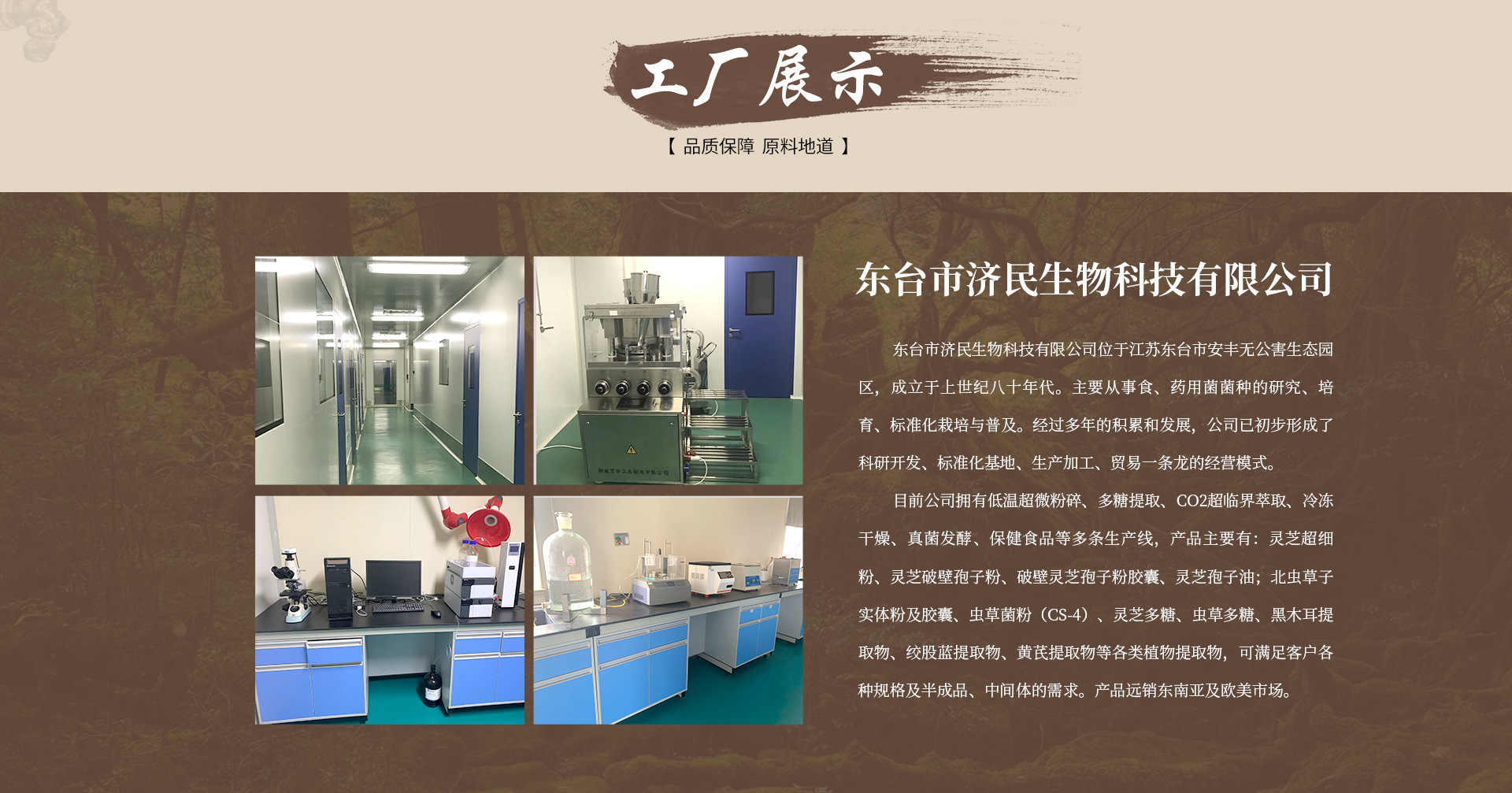 東臺(tái)市濟(jì)民生物科技有限公司位于江蘇東臺(tái)市安豐無公害生態(tài)園區(qū),成立于上世紀(jì)八十年代。主要從事食、藥用菌菌種的研究、培育、標(biāo)準(zhǔn)化栽培與普及。經(jīng)過多年的積累和發(fā)展,公司已初步形成了科研開發(fā)、標(biāo)準(zhǔn)化基地、生產(chǎn)加工、貿(mào)易一條龍的經(jīng)營模式。 目前公司擁有低溫超微粉碎、多糖提取、CO2超臨界萃取、冷凍干燥、真菌發(fā)酵、保健食品等多條生產(chǎn)線,產(chǎn)品主要有:靈芝超細(xì)粉、靈芝破壁孢子粉、破壁靈芝孢子粉膠囊、靈芝孢子油;北蟲草子實(shí)體粉及膠囊、蟲草菌粉(CS-4)、靈芝多糖、蟲草多糖、黑木耳提取物、絞股藍(lán)提取物、黃芪提取物等各類植物提取物,可滿足客戶各種規(guī)格及半成品、中間體的需求。產(chǎn)品遠(yuǎn)銷東南亞及歐美市場(chǎng)。