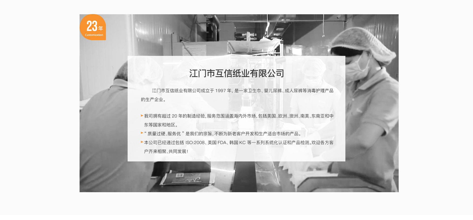 江門市互信紙業有限公司成立于1997年,是一家衛生巾、嬰兒尿褲、成人尿褲等消毒護理產品的生產企業。我司擁有超過20年的制造經驗,服務范圍涵蓋海內外市場,包括美國、歐洲、澳洲、南美、東南亞和中東等國家和地區。“質量過硬、服務優質”是我們的宗旨,不斷為新老客戶開發和生產適合市場的產品,本公司已經通過包括 ISO:2008、美國FDA、韓國KC 等一系列系統化認證和產品檢測。歡迎各方客戶齊來相聚、共同發展!