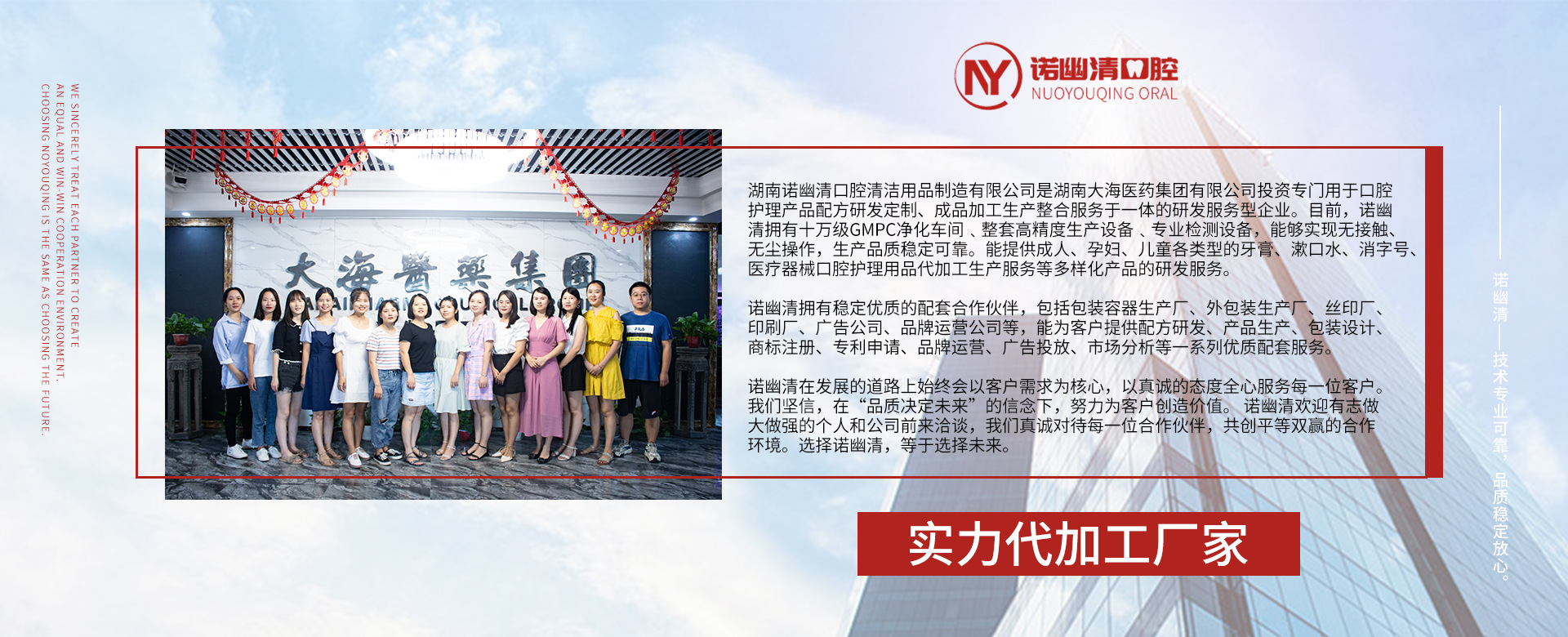 湖南諾幽清口腔清潔用品制造有限公司(以下簡稱:諾幽清)是湖南大海醫(yī)藥集團(tuán)有限公司(以下簡稱:大海集團(tuán))投資專門用于口腔護(hù)理產(chǎn)品配方研發(fā)定制、成品加工生產(chǎn)整合服務(wù)于一體的研發(fā)服務(wù)型企業(yè)。目前,諾幽清擁有專業(yè)的配套研發(fā)實(shí)驗(yàn)室、生產(chǎn)基地,通過嚴(yán)謹(jǐn)?shù)难邪l(fā)質(zhì)量管理體系﹐能提供成人、孕婦、兒童各類型的牙膏、漱口水、消字號(hào)、醫(yī)療器械口腔護(hù)理用品代加工生產(chǎn)服務(wù)等多樣化產(chǎn)品的研發(fā)服務(wù)。