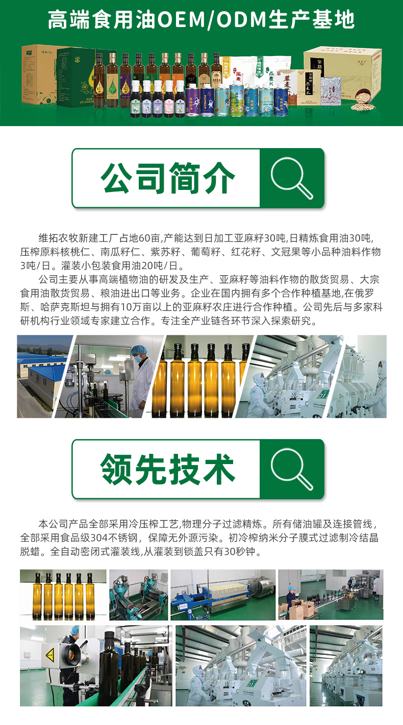 公司主營產品有亞麻籽油、核桃油、葡萄籽油、橄欖油、南瓜籽油、紅花籽油、紫蘇籽油、全胚芽燕麥米、藜麥米等全系列高端糧油產品,還可承接OEM代加工業務,100ml、150ml、250ml、500ml、1L、2L等多種規格。