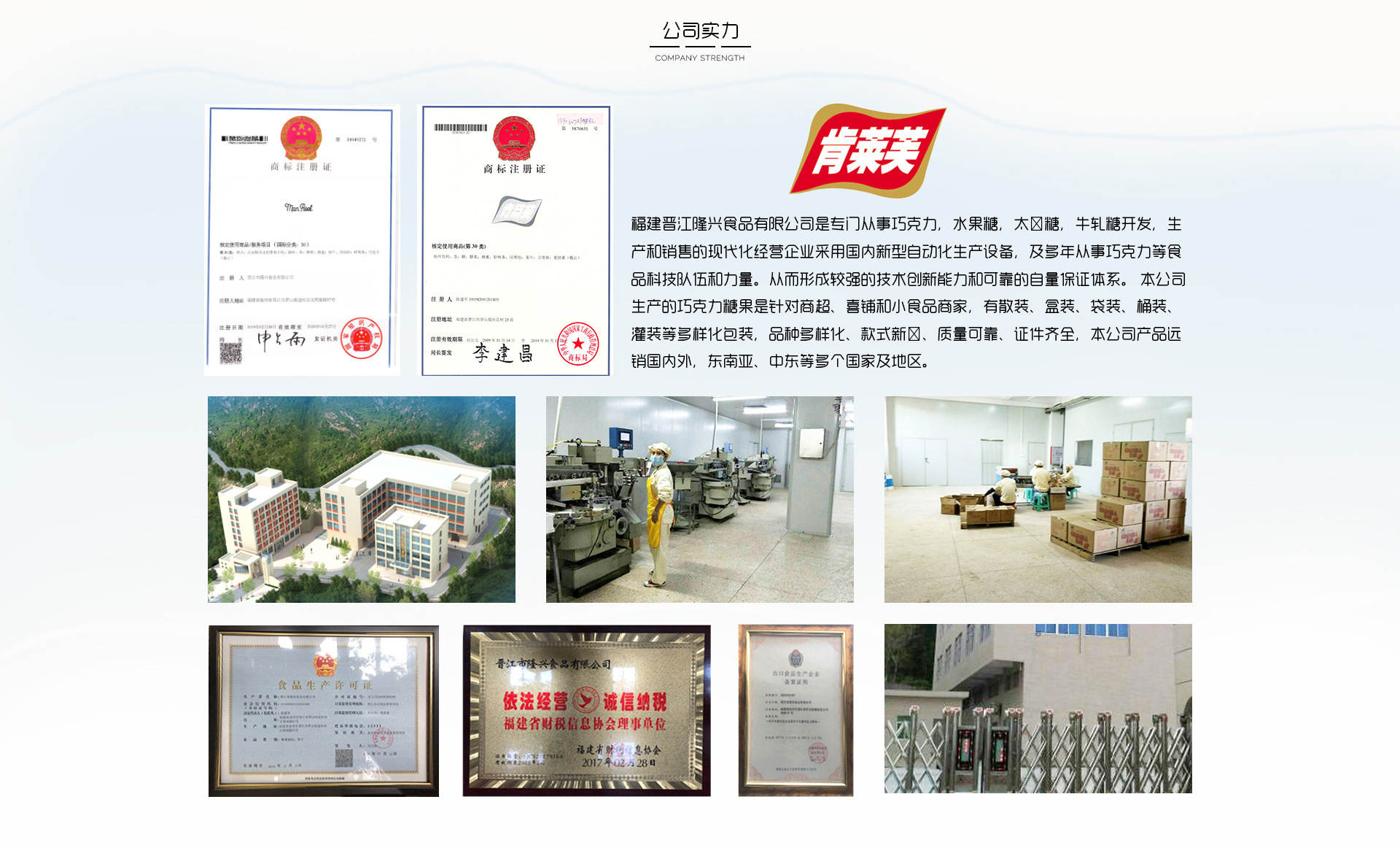 福建晉江隆興食品有限公司是專門從事巧克力、蛋卷、麥麗素、山楂球開發,生產和銷售的現代化經營企業采用國內新型自動化生產設備,及多年從事巧克力等食品科技隊伍和力量。從而形成較強的技術創新能力和可靠的自量保證體系。 本公司生產的巧克力糖果是針對商超、喜鋪和小食品商家,有散裝、盒裝、袋裝、桶裝、灌裝等多樣化包裝,品種多樣化、款式新穎、質量可靠、證件齊全,本公司產品遠銷國內外,東南亞、中東等多個國家及地區