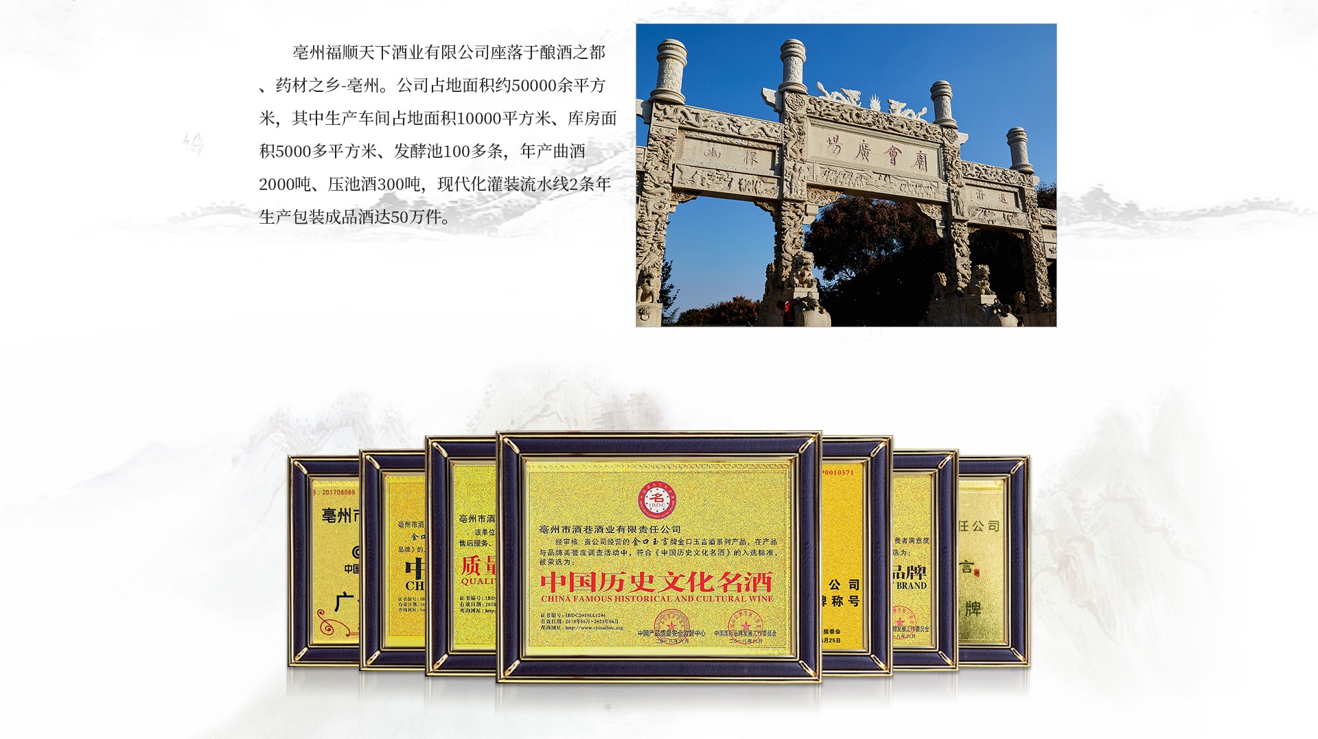安徽酒巷酒業(yè)座落于中國名酒釀酒之都、藥材之鄉(xiāng)-亳州。三國梟雄曹操擊退袁紹后曾屯兵減店,建作坊數(shù)十家,廣征天下名師開坊燒酒,犒賞將士,還親自督撰釀酒寶典《九醞春》獻(xiàn)于漢獻(xiàn)帝,從此古老的釀酒工藝便在渦河兩岸代代相傳。 酒巷酒業(yè)占盡天時(shí)、地利、人和,與沉淀了一千八百年的釀藝傳奇共同成就了“清如水晶、香如幽蘭、甘美醇和、回味悠長”的“金口玉言”系列產(chǎn)品,公司占地面積約50000余平方米,其中生產(chǎn)車間占地面積10000平方米、庫房面積5000多平方米、發(fā)酵池100多條,年產(chǎn)曲酒2000噸、壓池酒300噸,現(xiàn)代化灌裝流水線2條年生產(chǎn)包裝成品酒達(dá)50萬件。 2011年5月公司通過IS09001國家質(zhì)量體系認(rèn)證,2004年、2005年、2006年2008年.2009年.2010年.