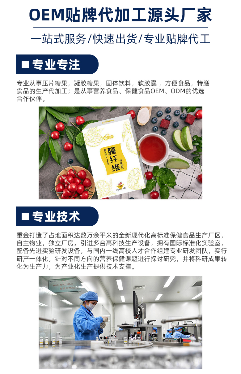 本公司主要生產(chǎn),凝膠糖果、軟膠囊、方便食品、特膳食品、固體飲料、壓片糖果、藥食同源系列等,承接項(xiàng)目(QS/SC):粉劑、顆粒劑、片劑泡騰片、代用茶、代餐包、五谷粉、酵素、藥食同源系列等。包含魚皮肽、瑪卡片、祛濕茶、人參肽、納豆片、降脂茶、牡蠣肽、氨糖鈣、補(bǔ)腎茶、牛骨肽、螯合鈣、降糖茶、大豆肽、初乳鈣、睡眠茶、苦瓜肽、沙棘片、減肥茶、復(fù)合肽、葉黃素、通便茶、益生菌、腎寶片、焦棗茶、蛋白粉、代餐粉、五谷粉、營養(yǎng)粉、電解質(zhì)、三七粉、駝奶粉、益生元、泡騰片等等。