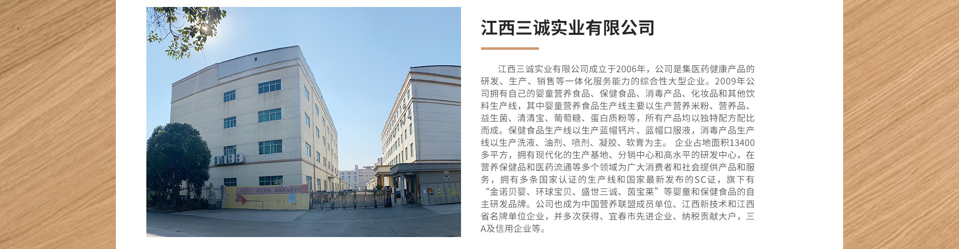 江西三誠實業有限公司成立于2006年,公司是集醫藥健康產品的研發、生產、銷售等一體化服務能力的綜合性大型企業。2009年公司擁有自己的嬰童營養食品、保健食品、消毒產品、化妝品和其他飲料生產線,其中嬰童營養食品生產線主要以生產營養米粉、營養品、益生菌、清清寶、葡萄糖、蛋白質粉等,所有產品均以獨特配方配比而成。保健食品生產線以生產藍帽鈣片、藍帽口服液,消毒產品生產線以生產洗液、油劑、噴劑、凝膠、軟膏為主。 企業占地面積13400多平方,擁有現代化的生產基地、分銷中心和高水平的研發中心,在營養保健品和醫藥流通等多個領域為廣大消費者和社會提供產品和服務,擁有多條國家認證的生產線和國家最新發布的SC證,旗下有“金諾貝嬰、環球寶貝、盛世三誠、茵寶萊”等嬰童和保健食品的自主研發品牌。公司也成為中國營養聯盟成員單位、江西新技術和江西省名牌單位企業,并多次獲得、宜春市先進企業、納稅貢獻大戶,三A及信用企業等。