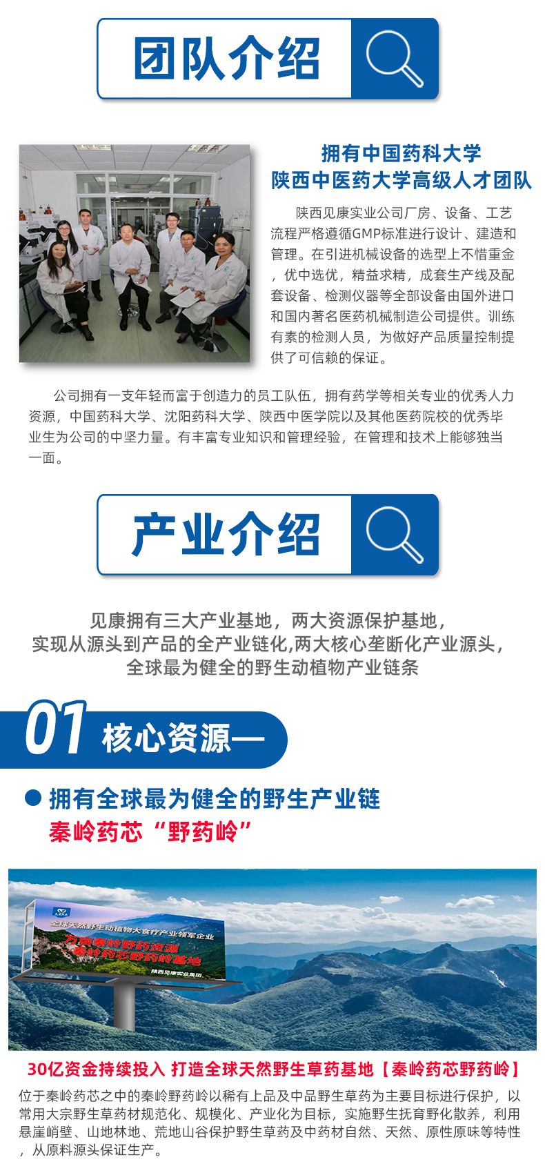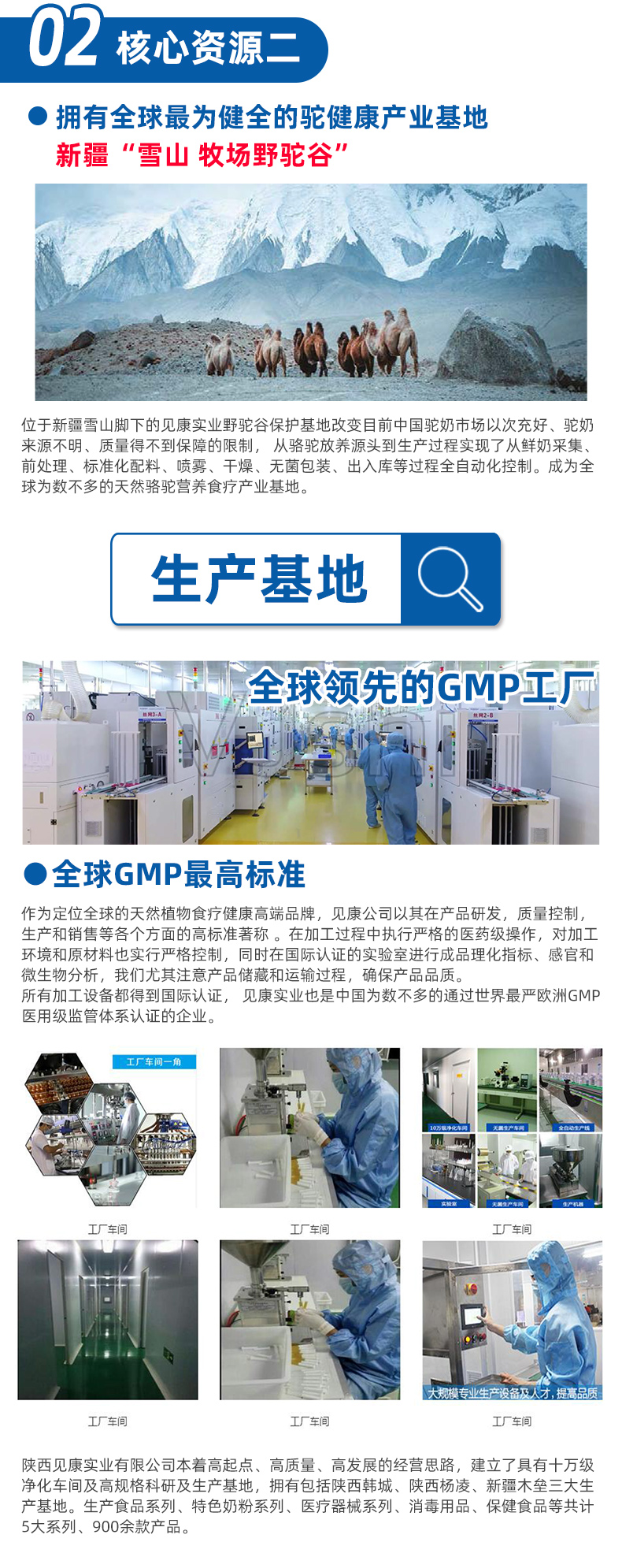 本著高起點、高質量、高發展的經營思路,陜西見康實業建立了具有十萬級凈化車間及高規格科研及生產基地,擁有陜西韓城、陜西楊凌、新疆木壘三大生產基地。同時獨家擁有兩大國際級野生資源保護基地,斥巨資在1400年前唐代皇家太醫署藥材禁苑原址基礎上建立全球唯一的秦嶺藥芯野藥嶺野生藥材保護地,另外以新疆木壘雪山沙漠牧場為保護地,建立全球最大的野外駱駝營養動物保護地,形成了以三大生產基地、兩大產業基地為核心的大產業發展格局。