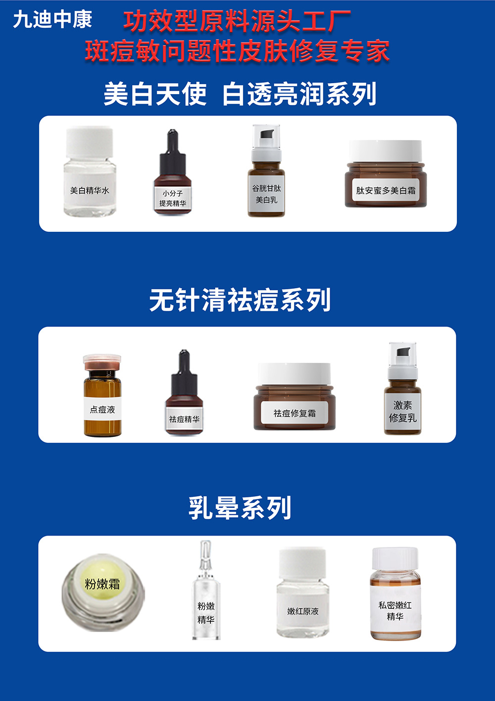 廣州九迪生物科技有限公司是一家集生化科技、醫(yī)藥、美容保健品的研發(fā)、專業(yè)制造與銷售、OEM/ODM及半成品銷售為一體的多元化國(guó)際性公司,與國(guó)際著名的醫(yī)藥企業(yè)和大學(xué)機(jī)構(gòu)有良好合作關(guān)系,一直致力于世界上先進(jìn)的美容理念和美容產(chǎn)品,長(zhǎng)期致力創(chuàng)造值得人們信賴、且具有品質(zhì)的美容護(hù)膚產(chǎn)品,并始終秉承“堅(jiān)持品質(zhì)”的理念,帶給世界許許多多的愛(ài)美的女性朋友。