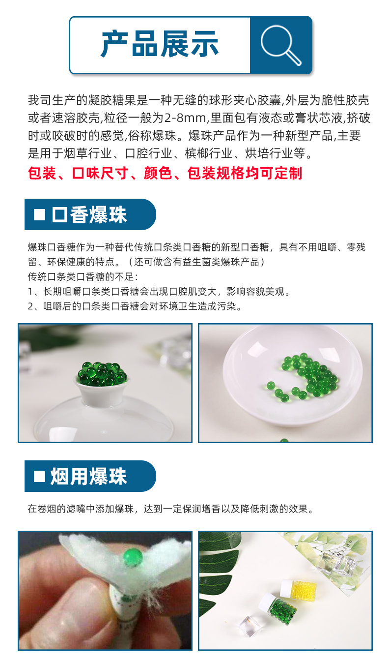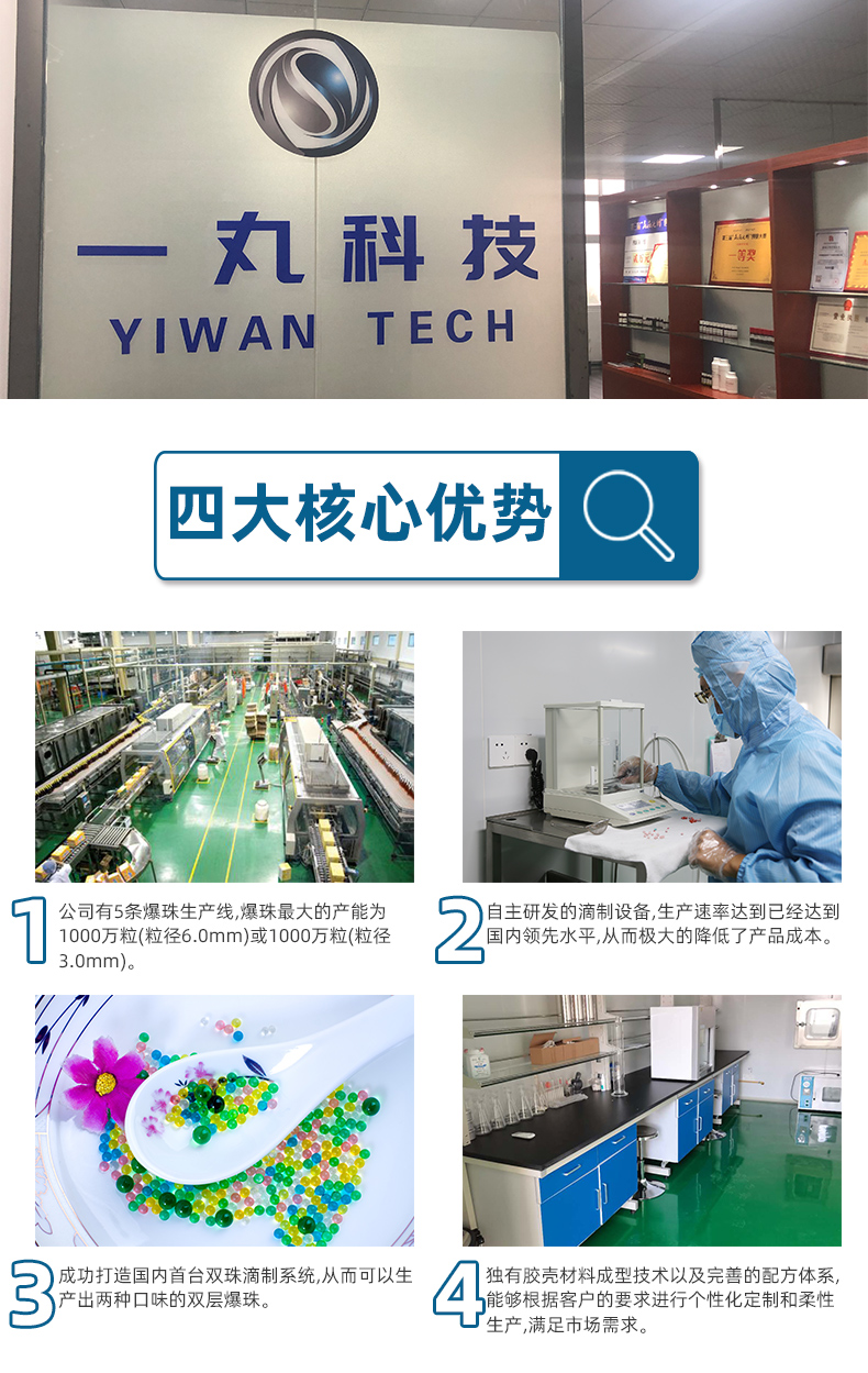 業(yè)務范圍主要有:生物科技、新型材料、食品科技領域內(nèi)的技術開發(fā)、技術轉(zhuǎn)讓、技術咨詢及技術服務;爆珠食品、香精滴丸、凝膠糖果、口香糖、營養(yǎng)品、化妝品、日化用品,研發(fā)、生產(chǎn)、銷售和技術服務等。但公司的主要核心業(yè)務是生產(chǎn)和銷售爆珠食品,以及由爆珠衍生出的一些功能類食品。公司創(chuàng)始團隊成員具有豐富的食品行業(yè)或材料行業(yè)的工作經(jīng)驗,熟悉國內(nèi)膠囊爆珠行業(yè)的運行規(guī)則及發(fā)展方向,團隊中的成員將發(fā)揮各自的專長,共同促進安徽一丸公司的發(fā)展和壯大。公司創(chuàng)始團隊中碩士以上學歷占團隊總?cè)藬?shù)的60%,通過產(chǎn)學研合作,我司團隊已與山東科技大學、青島科技大學等高校在新型膠殼材料、活性芯液等領域達成意向合作,共同推進我國膠囊爆珠的高質(zhì)量發(fā)展,從而為消費者提供更多更好的產(chǎn)品。