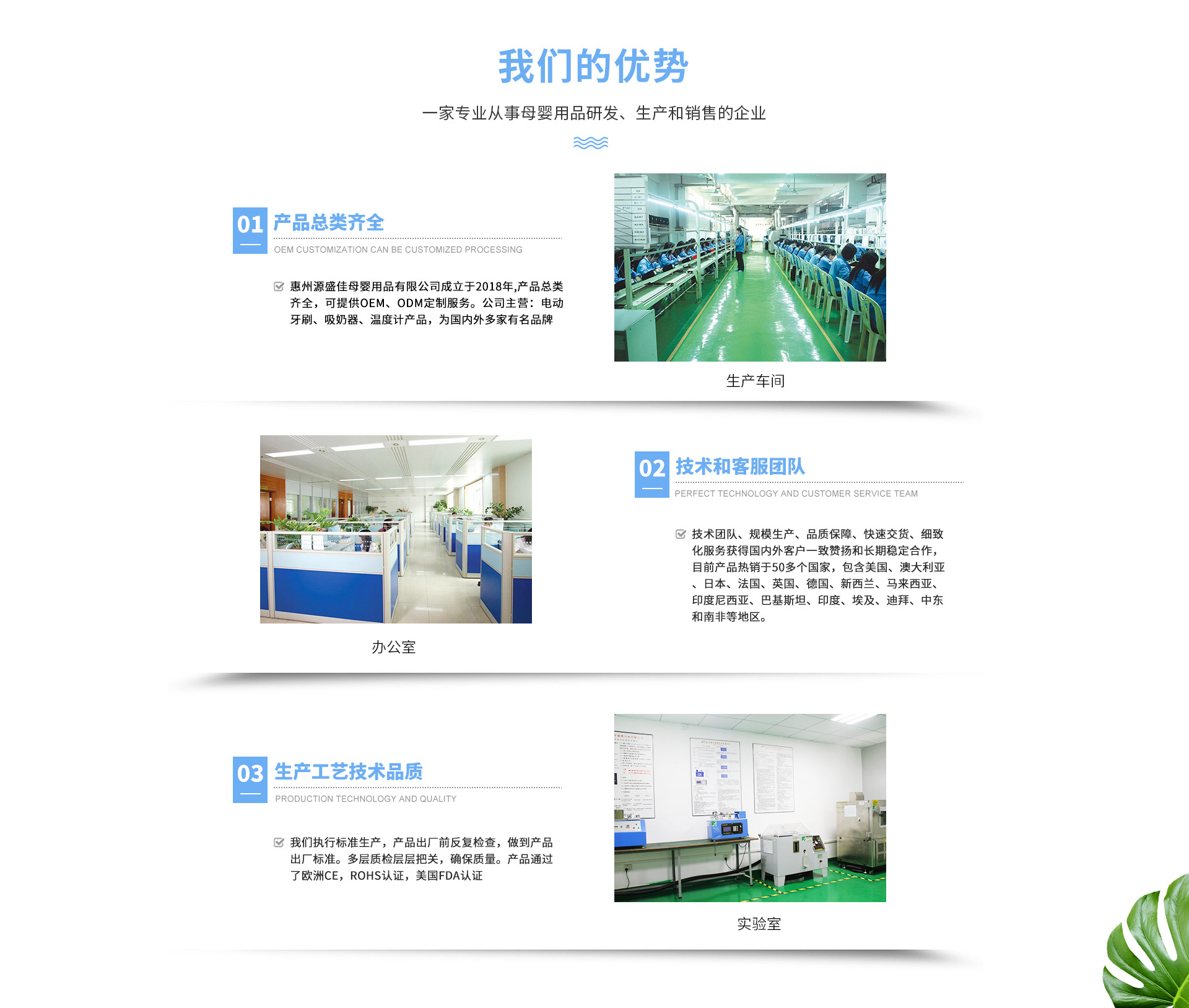 惠州源盛佳母嬰用品有限公司成立于2018年,是一家專業從事母嬰用品研發、生產和銷售的高科技企業。 公司主營:電動牙刷、吸奶器、溫度計產品,為國內外多家知名品牌提供可靠OEM/ODM服務。目前產品暢銷50多個國家,包含美國、澳大利亞、日本、法國、英國、德國、新西蘭、馬來西亞、印度尼西亞、巴基斯坦、印度、埃及、迪拜、中東和南非等地區。 高效團隊、規模生產、嚴控品質、快速交貨、國際資質認證和細致化服務獲得國內外客戶一致贊揚和長期穩定合作。