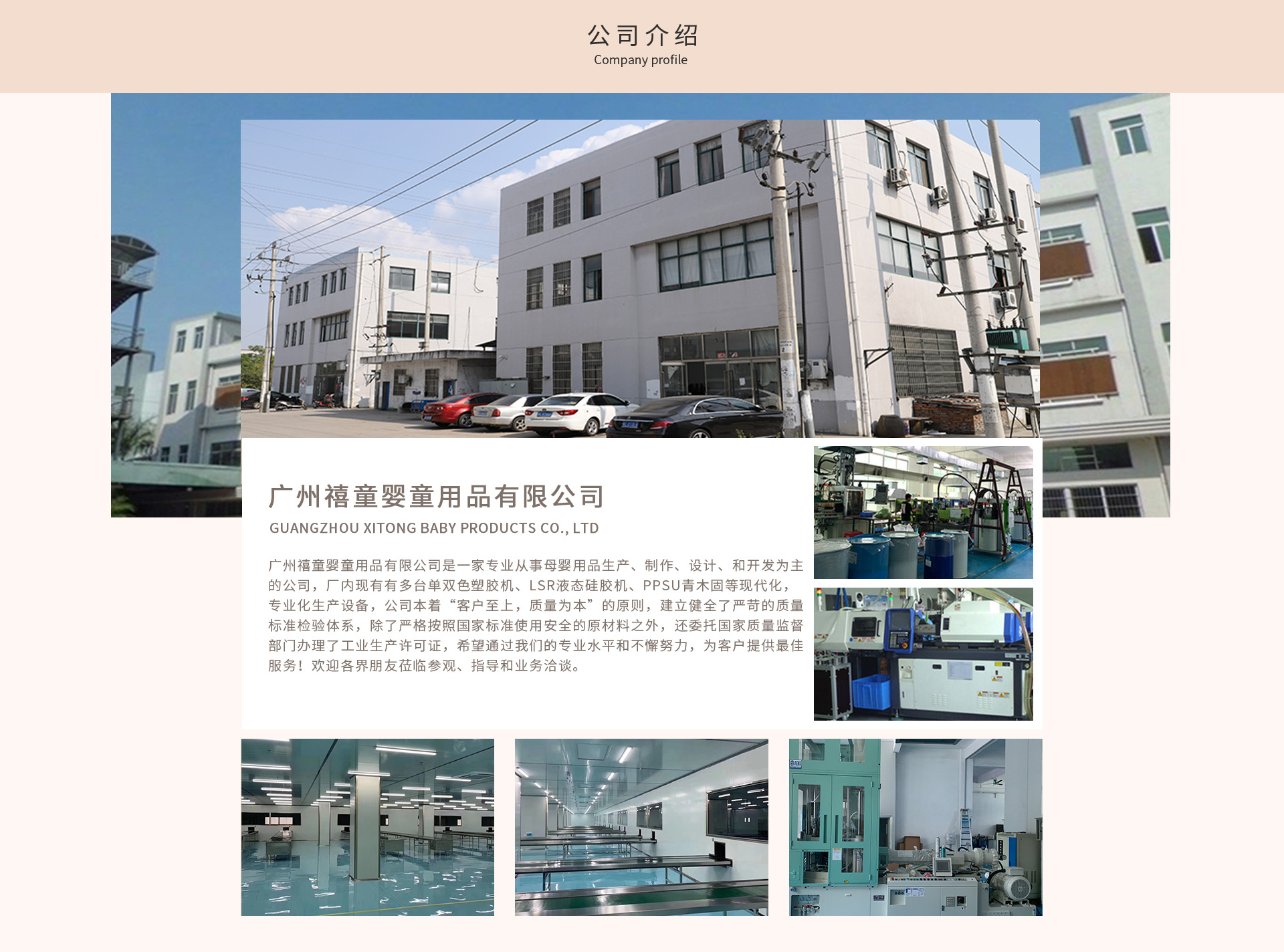 廣州禧童嬰童用品有限公司是一家專(zhuān)業(yè)從事母嬰用品生產(chǎn)、制作、設(shè)計(jì)、和開(kāi)發(fā)為主的公司,廠(chǎng)內(nèi)現(xiàn)有有多臺(tái)單雙色塑膠機(jī)、LSR液態(tài)硅膠機(jī)、PPSU青木固等現(xiàn)代化,專(zhuān)業(yè)化生產(chǎn)設(shè)備,公司本著“客戶(hù)至上,質(zhì)量為本”的原則,建立健全了嚴(yán)苛的質(zhì)量標(biāo)準(zhǔn)檢驗(yàn)體系,除了嚴(yán)格按照國(guó)家標(biāo)準(zhǔn)使用安全的原材料之外,還委托國(guó)家質(zhì)量監(jiān)督部門(mén)辦理了工業(yè)生產(chǎn)許可證,希望通過(guò)我們的專(zhuān)業(yè)水平和不懈努力,為客戶(hù)提供最佳服務(wù)!歡迎各界朋友蒞臨參觀、指導(dǎo)和業(yè)務(wù)洽談。