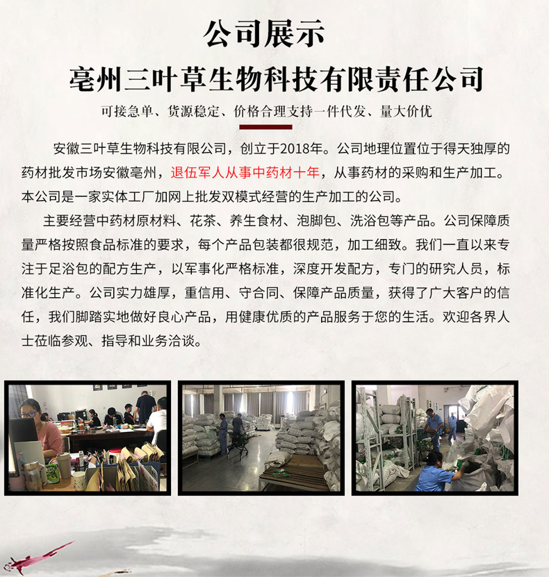 亳州三葉草生物科技有限責(zé)任公司 是一家誠信合作,真誠合作,共贏合作的公司,公司位于安徽亳州市,有著得天獨厚的中藥材原材料市場,公司致力于發(fā)展,足浴包,熏蒸包,洗澡包,中藥材材料包。深度開發(fā),專業(yè)的科研人員。。歡迎您的參觀考察本公司。