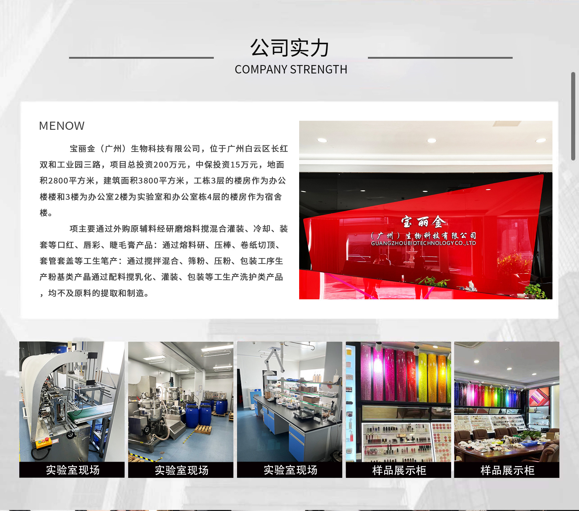 寶麗金廣州物技有限公選于州白云區(qū)長紅雙和工業(yè)園三路項(xiàng)目總投資200萬元中保投 資15萬元,地面積2800平方米,建筑面積3800平方米期膀2科作閑置廠房不屬于本 項(xiàng)、工棟3層的樓房作為辦公樓樓和3樓為辦公室2樓為實(shí)驗(yàn)室和辦公室棟4層的樓房 作為宿舍樓 項(xiàng)主要通過外購原輔料經(jīng)研磨焙料攪混合灌裝、冷卻、裝套等工紅、唇彩、睫毛育 產(chǎn)品:通過熔料研、壓棒、卷紙切頂、套管套蓋等工生筆產(chǎn):通過攪拌混合、篩 粉、壓粉、包裝工序生產(chǎn)粉基類產(chǎn)晶通過配料攪乳化、灌裝、包裝等工生產(chǎn)洗護(hù)類 產(chǎn)品,均不及原料的提取和制造。