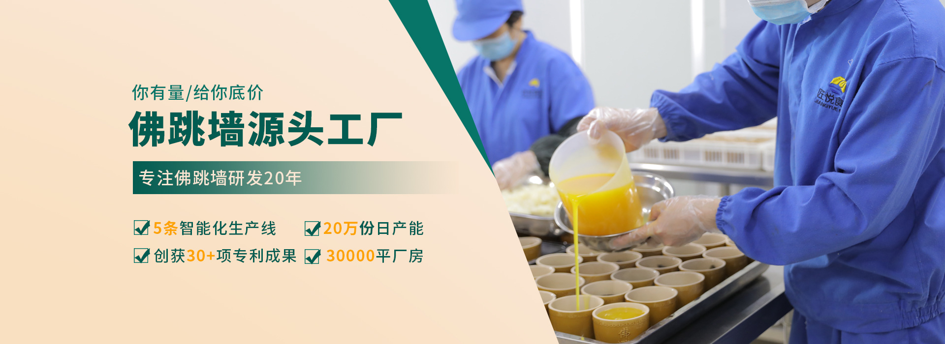 匠悅食品專注于生產與研發燕、鮑、參、肚等高端食材的定制,以現代化,標準化,規范化生產工藝要求,堅持健康飲食理念為宗旨,集產品研發、生產、銷售、推廣為一體,以中高端食材深加工為主的綜合性食品有限公司。匠悅始終堅持“產品安全,品質至上”的經營理念,供應安全、健康、營養的中高端食材。 匠悅擁有專業的大廚研發團隊,技術力量雄厚;廠房硬件設備完善,生產設備先進;擁有經驗豐富的生產管理團隊,嚴格把控原材料采購的品質,確保產品質量穩定,品質優良。產品以港式盆菜,佛跳墻,鮑魚,燕窩,魚翅等中高端食材為主,匠悅產品已得到廣大客戶的高度認可。